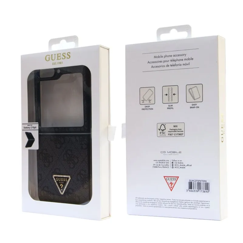 Kryt je doplněn o trojhelníkové kovové logo značky Guess na zadní straně.