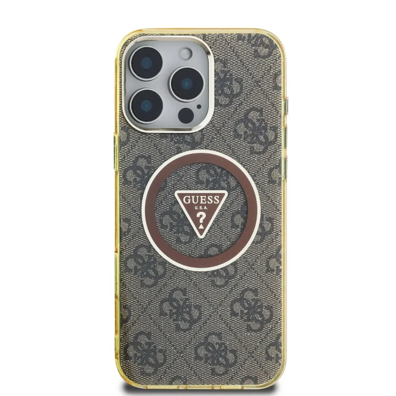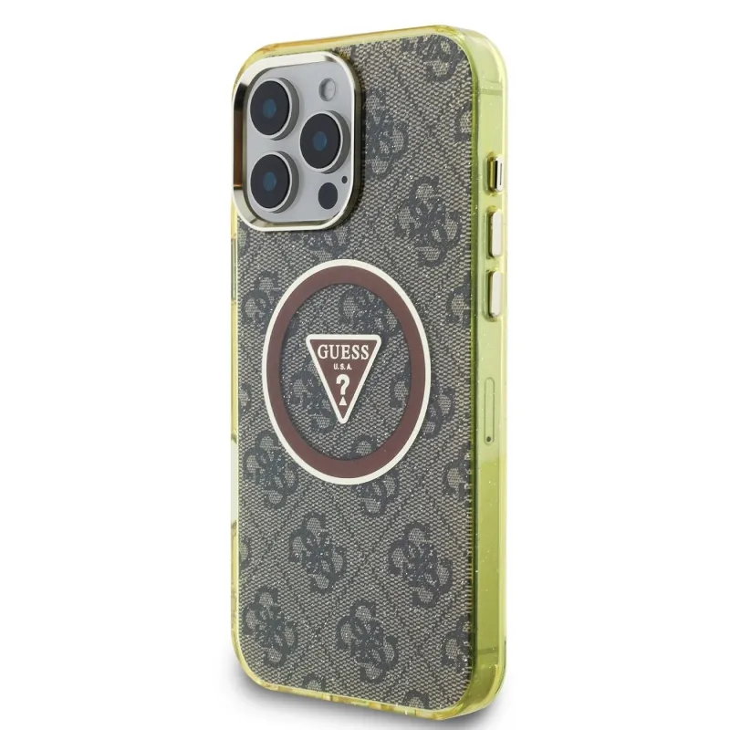 Guess IML 4G Glitter and Triangle Logo MagSafe zadný kryt pre iPhone 16 Pro Max Brown