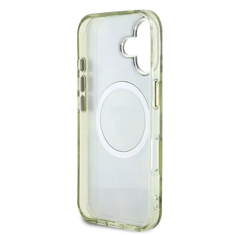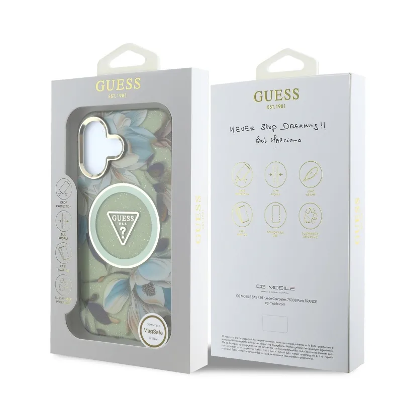 Guess IML Glitter Magnolia and Triangle Logo MagSafe zadný kryt pre iPhone 16 Green