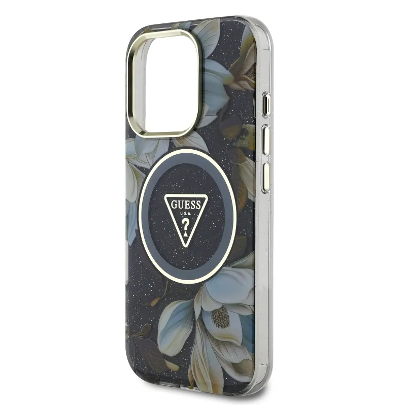 Guess IML Glitter Magnolia and Triangle Logo MagSafe zadný kryt pre iPhone 16 Pro Max Black