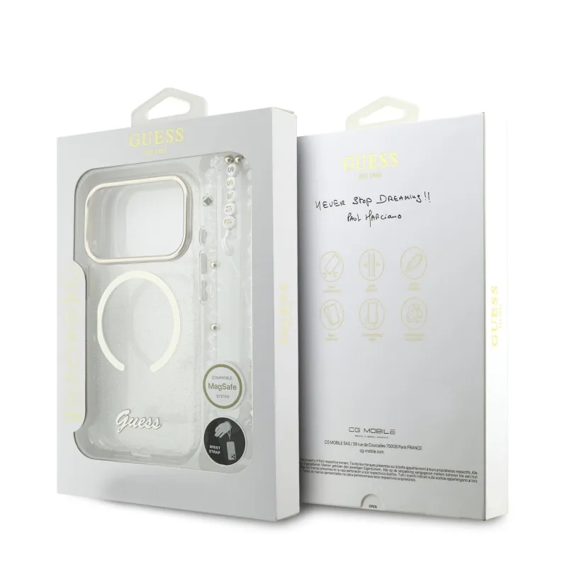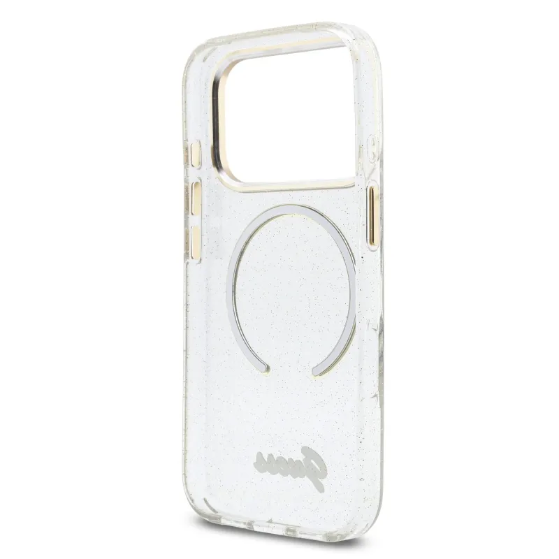 Guess IML Glitter Script Strap MagSafe zadný kryt pre iPhone 17 Pro Transparent