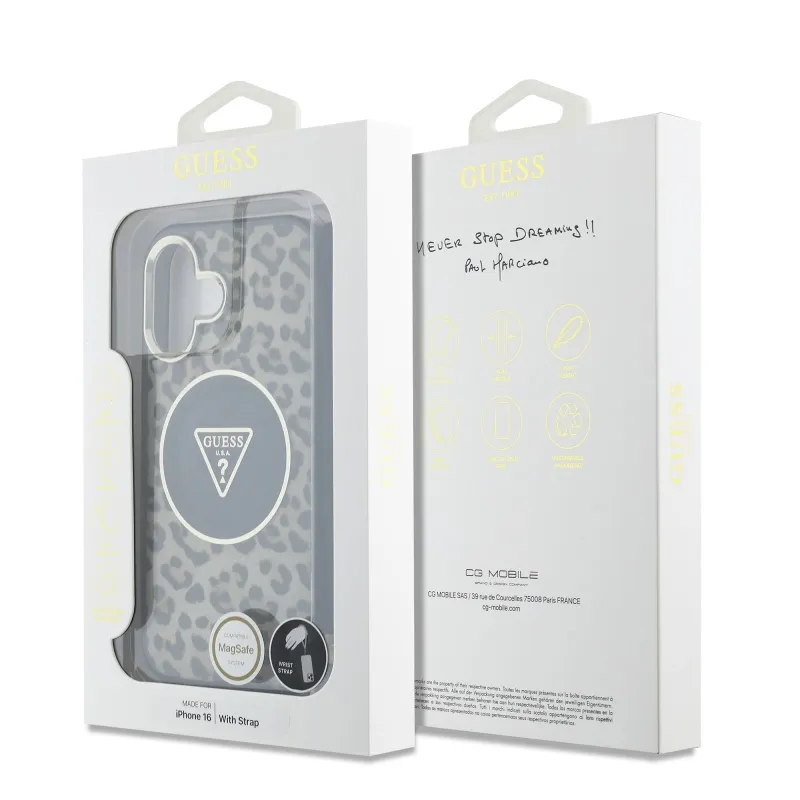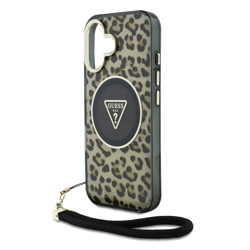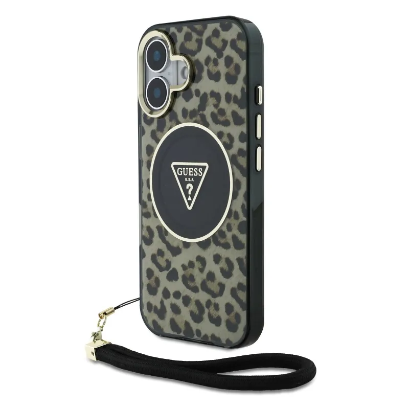 Guess IML Leopard Triangle Logo Strap MagSafe zadný kryt pre iPhone 16 Brown