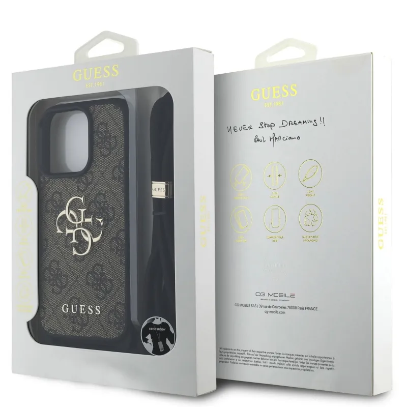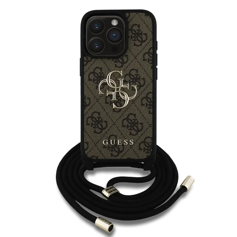 Guess PU 4G Kovové logo Crossbody Strap Zadný kryt pre iPhone 15 Pro Brown