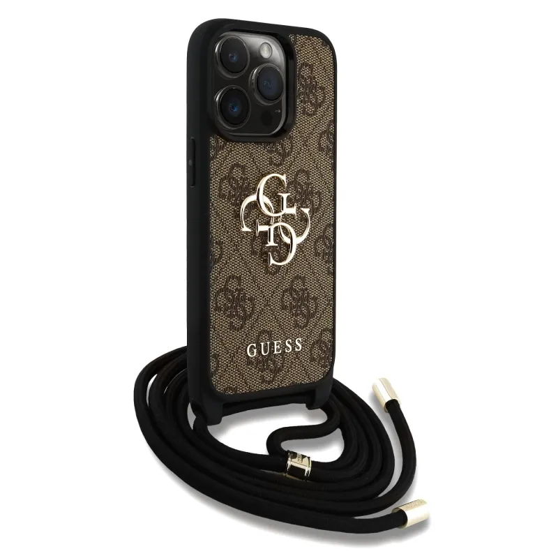 Guess PU 4G Kovové logo Crossbody Strap Zadný kryt pre iPhone 15 Pro Max Brown