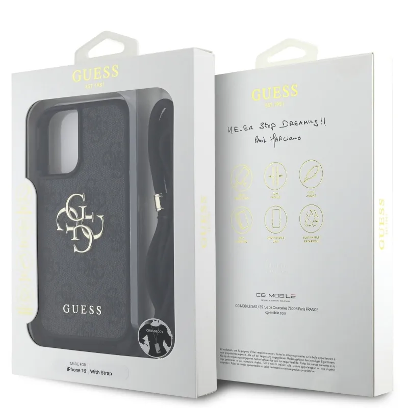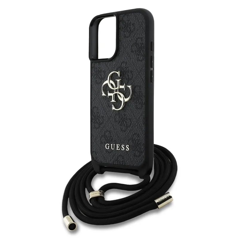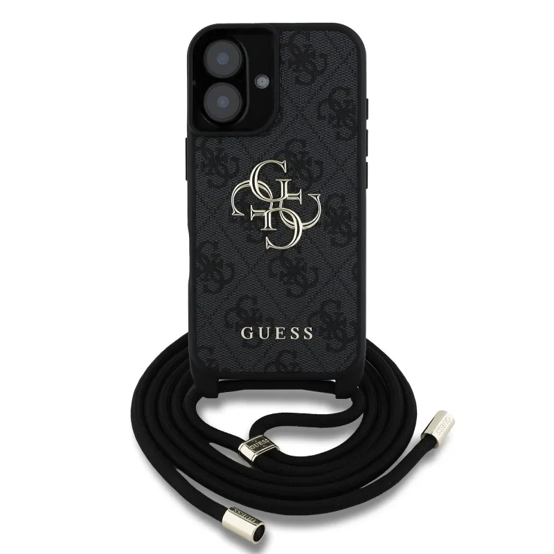 Guess PU 4G Kovové logo Crossbody Strap Zadný kryt pre iPhone 16 Black