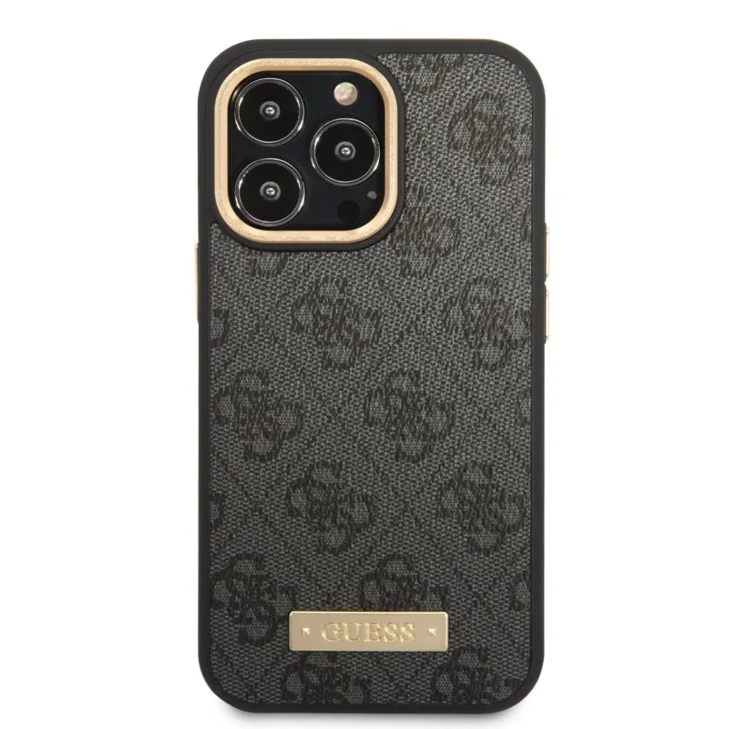Guess 4G Magnetic prémiový ochranný kryt telefonu v kombinaci zadní strany s potažená látkou s motivem Guess, pružnými PU boky a vestavěným magnetem pro Apple MagSafe příslušenství.