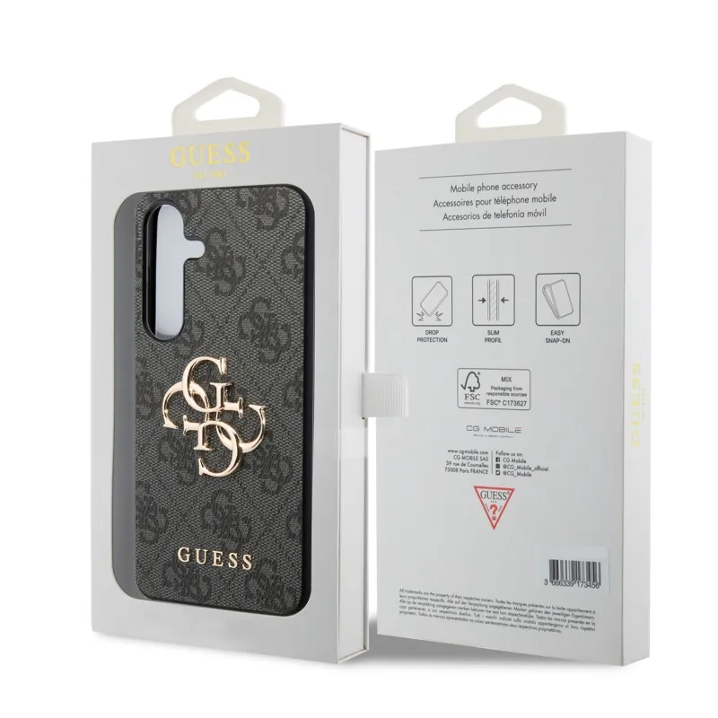 Prémiový zadní kryt Guess PU 4G Metal Logo se vyznačuje elegantním, charakteristickým 4G vzorem, doplněným o logo GUESS.