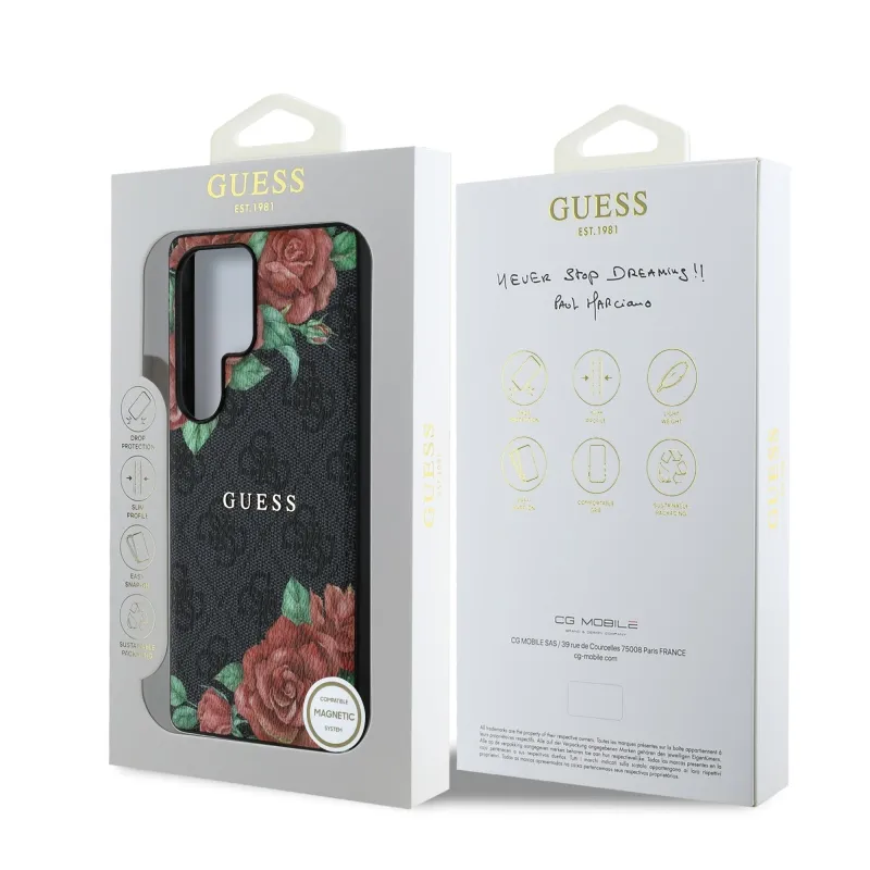 Guess PU Leather 4G Flowers Print Metal Classic Logo MagSafe Zadný Kryt pre Samsung Galaxy S25 Ultra Black