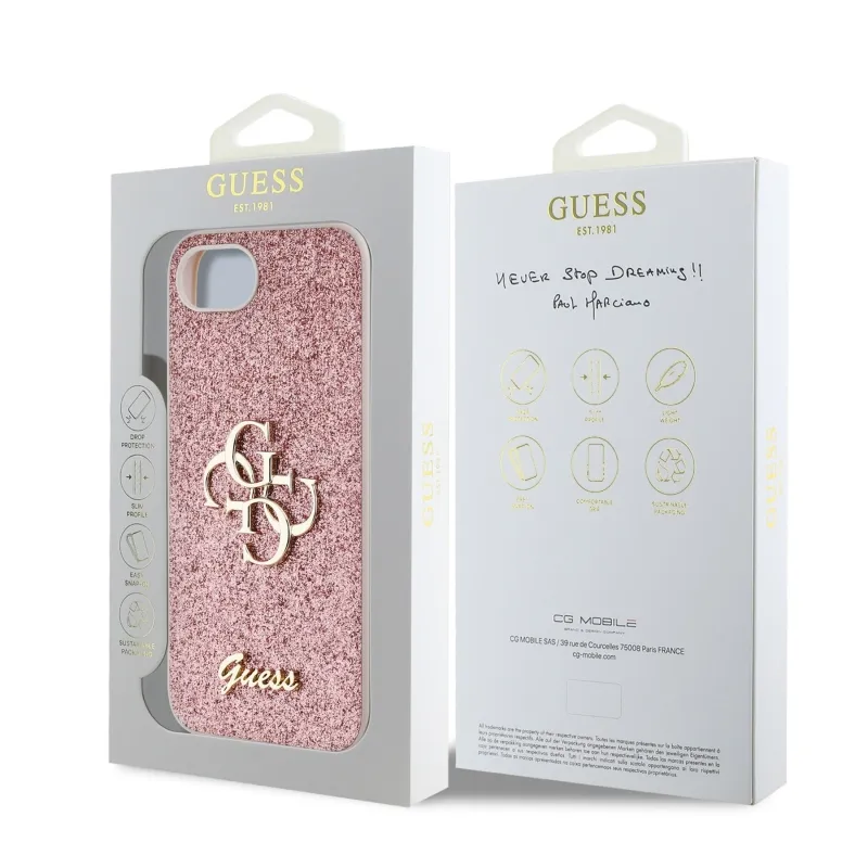 Guess PU pevný zadný kryt s kovovým logom 4G s trblietkami pre iPhone SE4 Pink