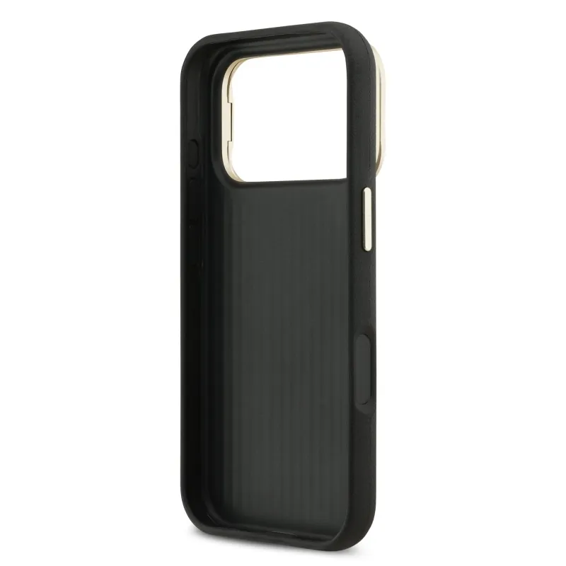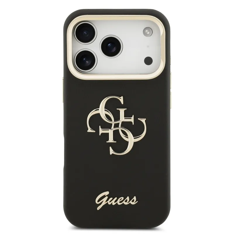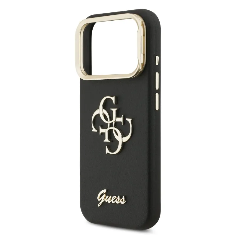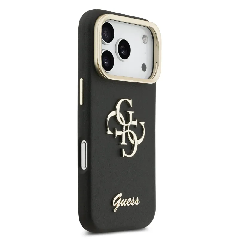Guess PU zrnité logo 4G Stojan na fotoaparát Zadný kryt pre iPhone 17 Pro Black