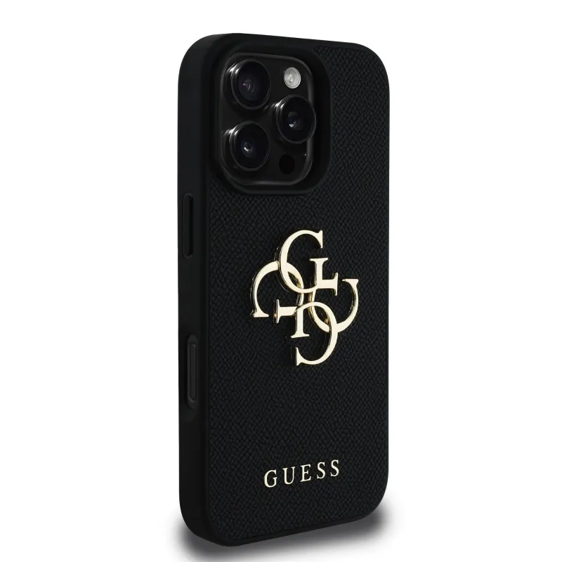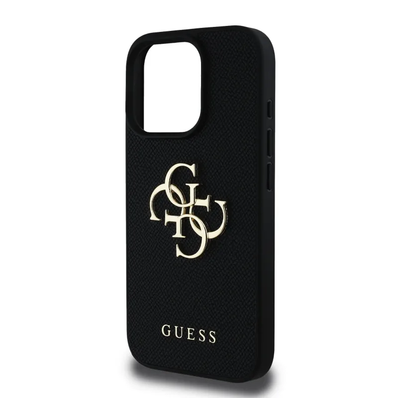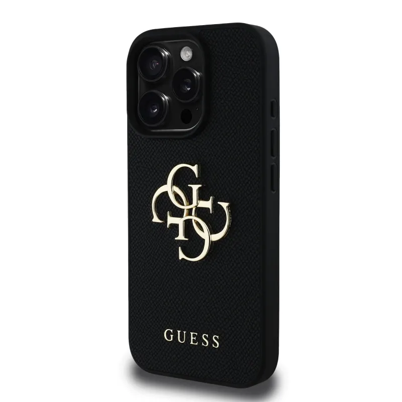 Guess PU zrnitý 4G kovový zadný kryt s logom pre iPhone 16 Pro Max Black