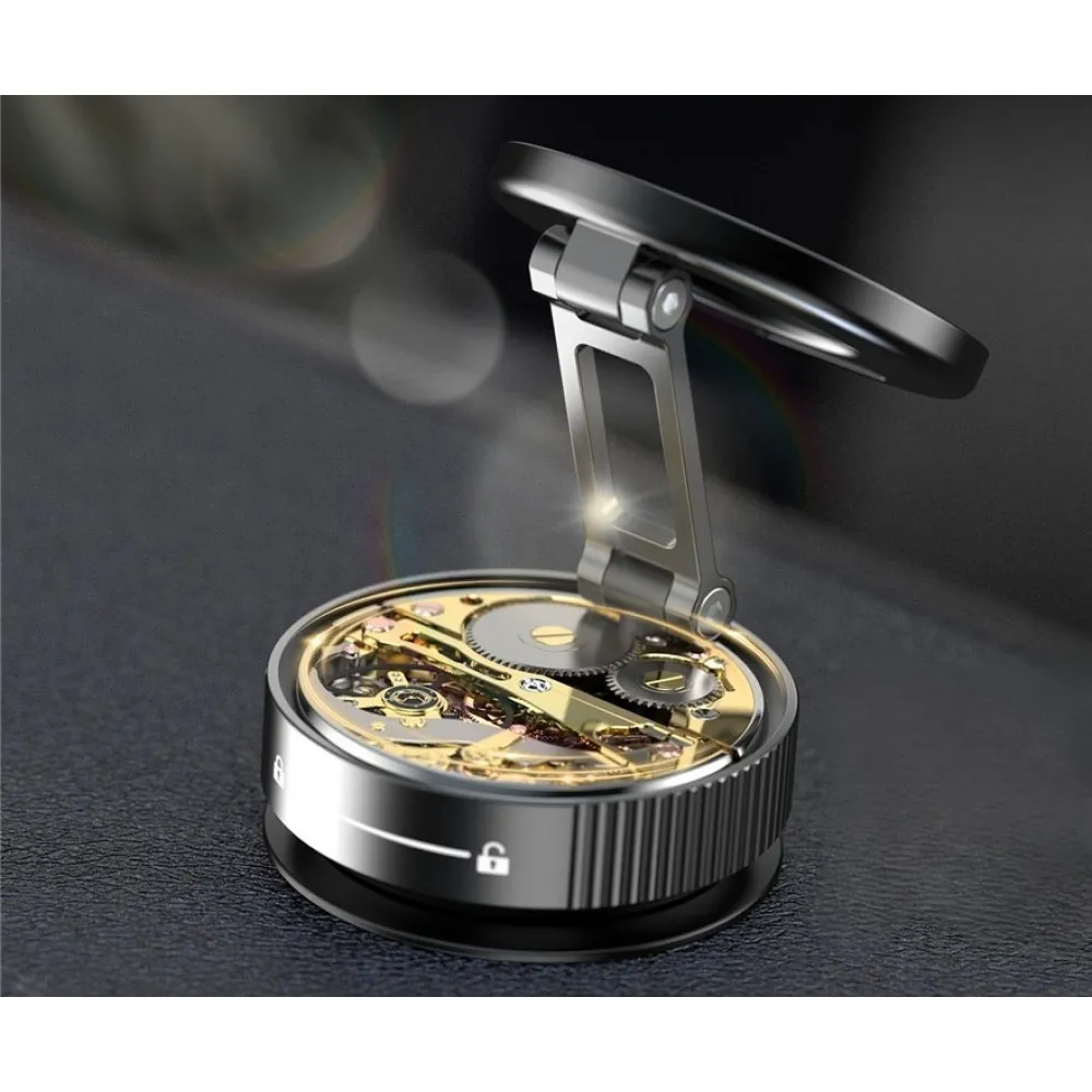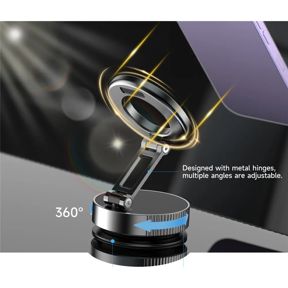 Univerzálny strieborný skladací držiak na mobil s magnetickým uchytením a silnou vákuovou prísavkou na použitie na stole aj v aute.
