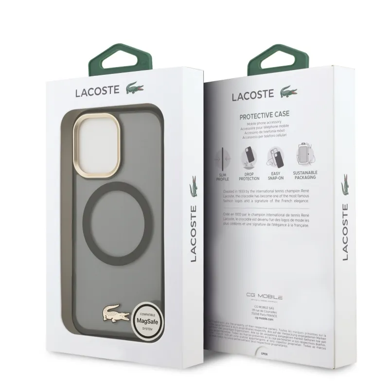 Lacoste PC/TPU Frosted Finish Gold Logo MagSafe Zadní Kryt je tu, aby tvůj iPhone nejen chránil, ale také podtrhl svůj styl a prémiový vzhled.