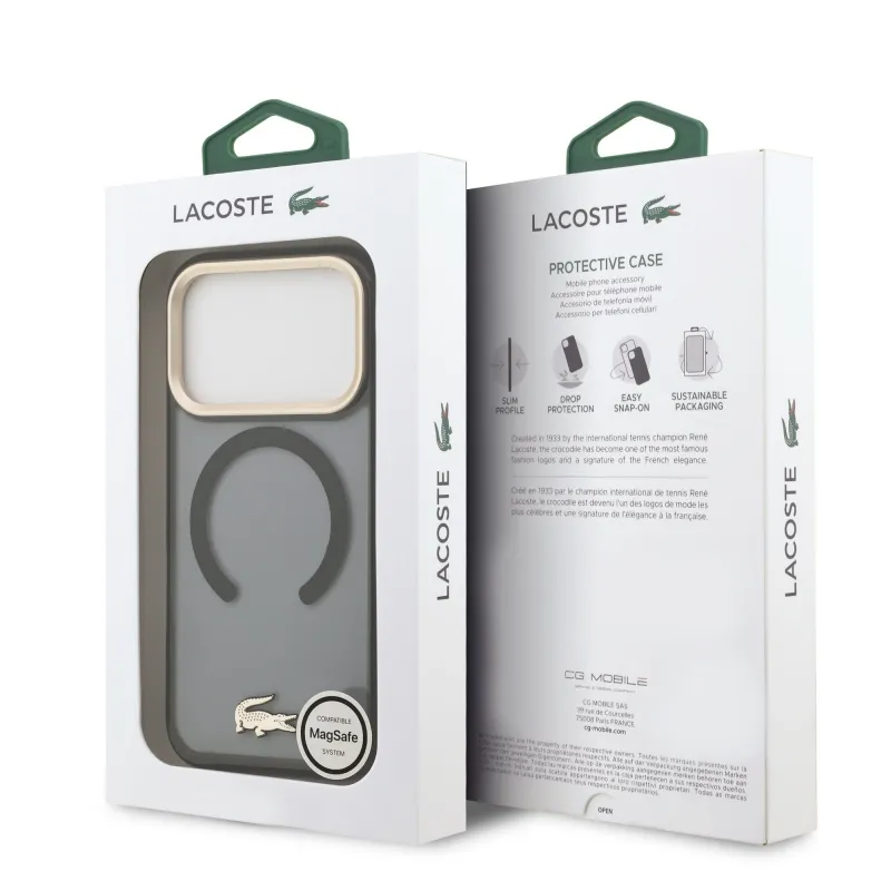 Lacoste PC/TPU Frosted Finish Gold Logo MagSafe Zadní Kryt je tu, aby tvůj iPhone nejen chránil, ale také podtrhl svůj styl a prémiový vzhled.
