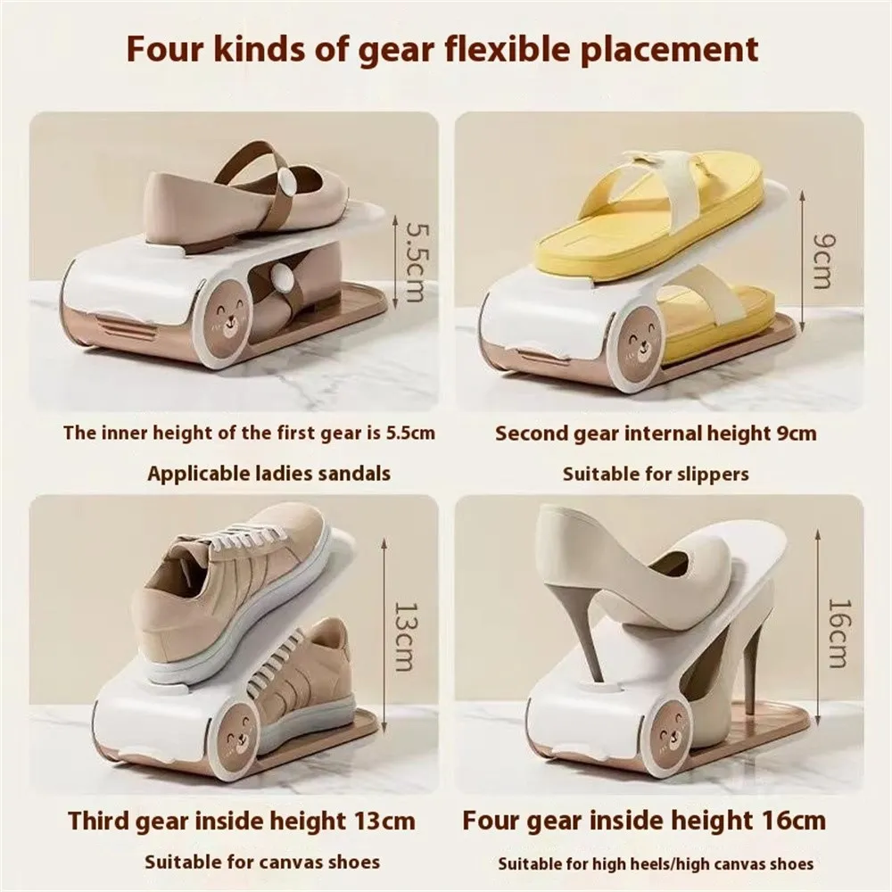Materiál: PP Rozmery: 26 × 10,5 × 6,5 cm Nastavenie výšky: 4 úrovne Vhodné pre: detské topánky, tenisky, papuče, vysoké podpätky, baleríny Úspora miesta: až 50 percent