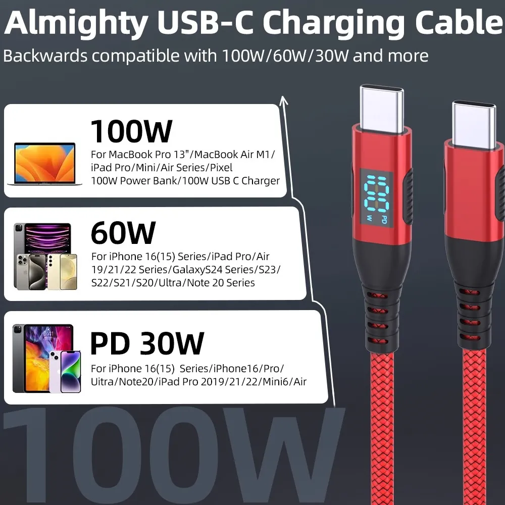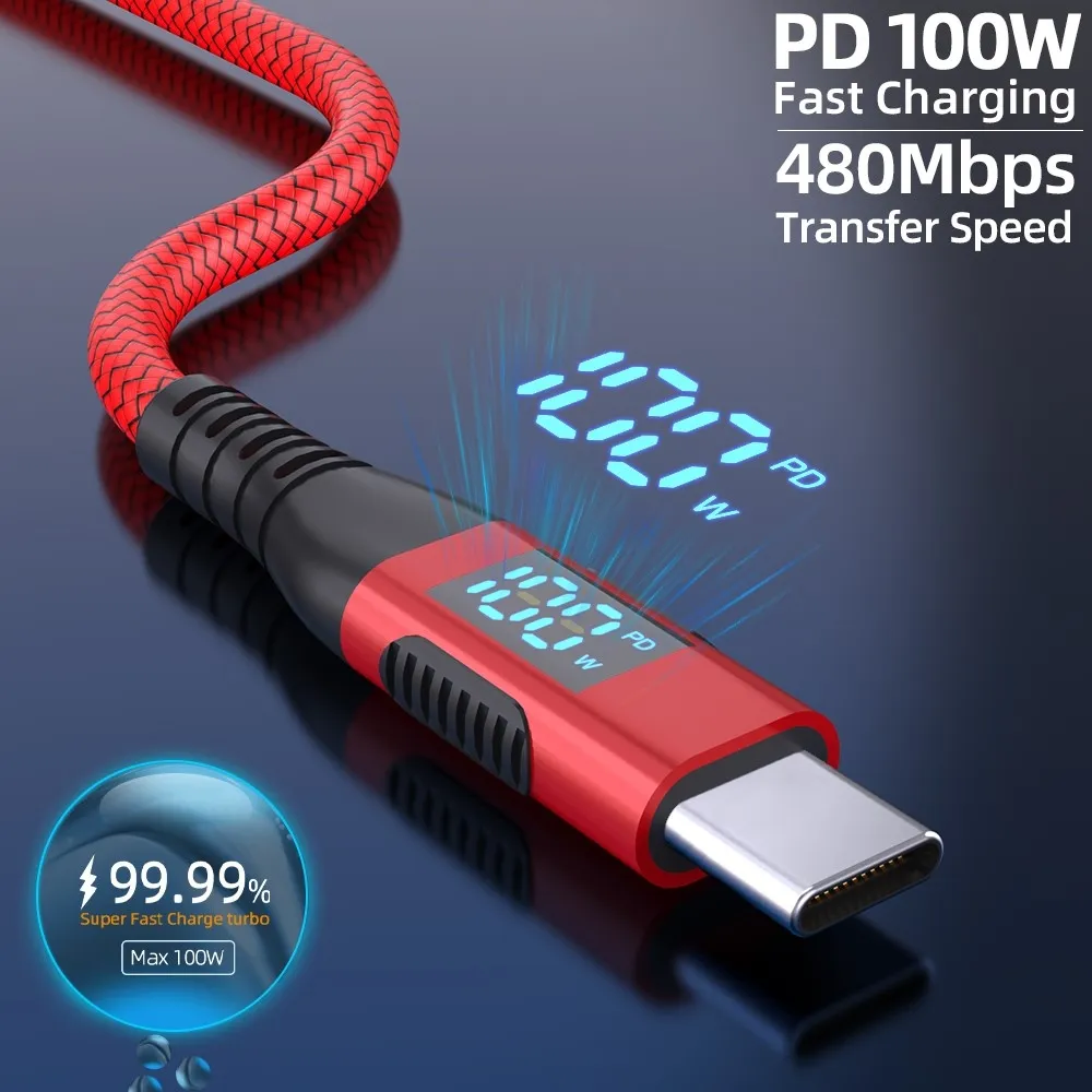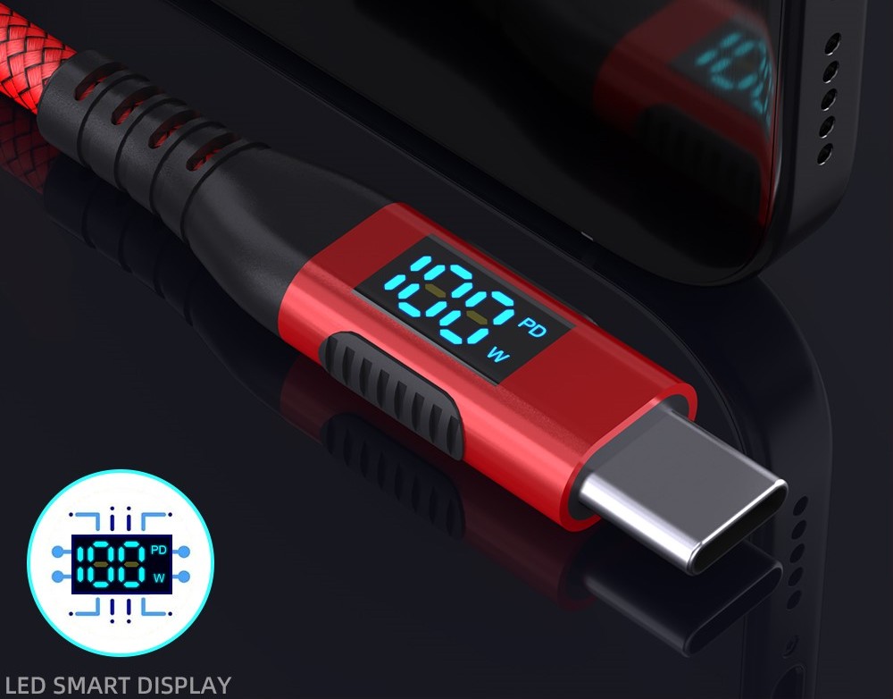 Odolný červený USB-C kábel s displejom, dĺžkou 1 ma podporou 100W rýchleho nabíjania pre maximálny výkon.