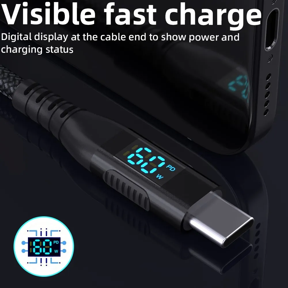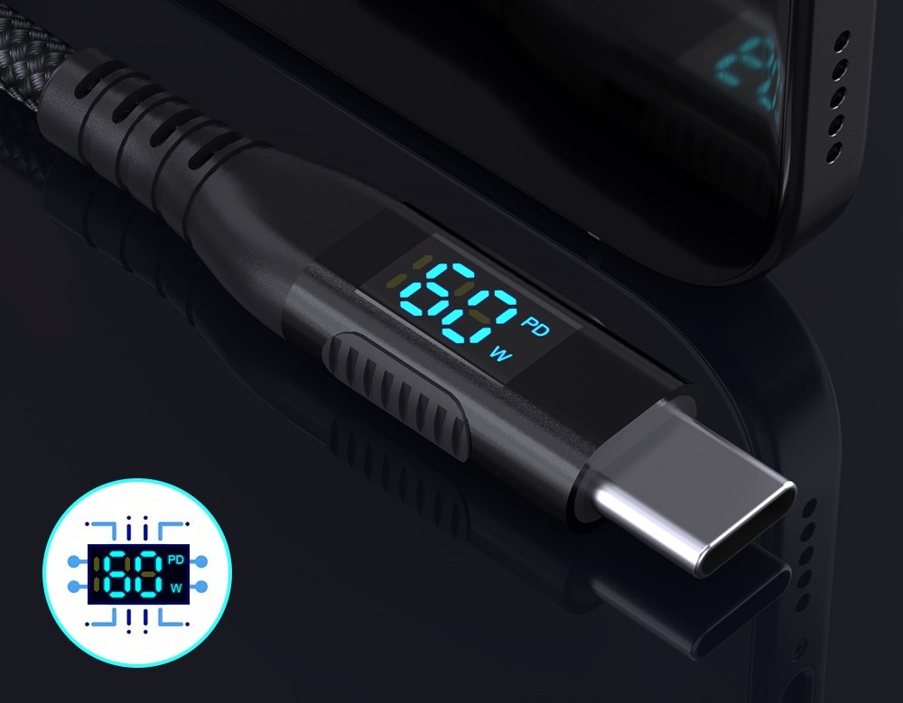 Integrovaný digitálny displej zobrazuje aktuálny výkon nabíjania v reálnom čase, čo poskytuje prehľad o priebehu nabíjania. Kábel podporuje technológie PD, QC, AFC a FCP, vďaka čomu zaisťuje rýchle a efektívne nabíjanie.