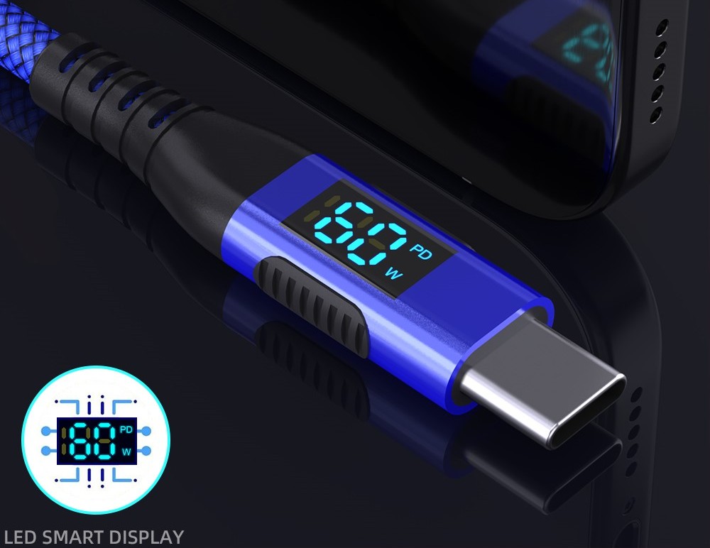 Odolný modrý USB-C kábel s displejom, dĺžkou 3 ma podporou 60W rýchleho nabíjania pre spoľahlivé každodenné použitie.