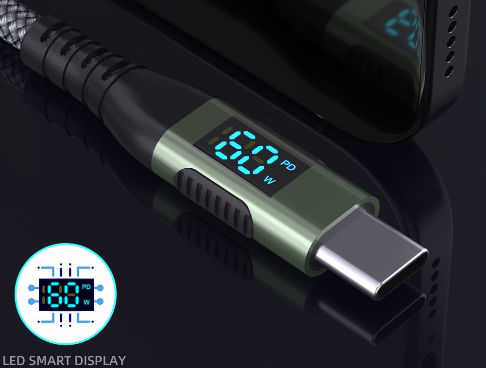 Integrovaný digitálny displej zobrazuje aktuálny výkon nabíjania v reálnom čase, čo poskytuje prehľad o priebehu nabíjania. Kábel podporuje technológie PD, QC, AFC a FCP, vďaka čomu zaisťuje rýchle a efektívne nabíjanie.
