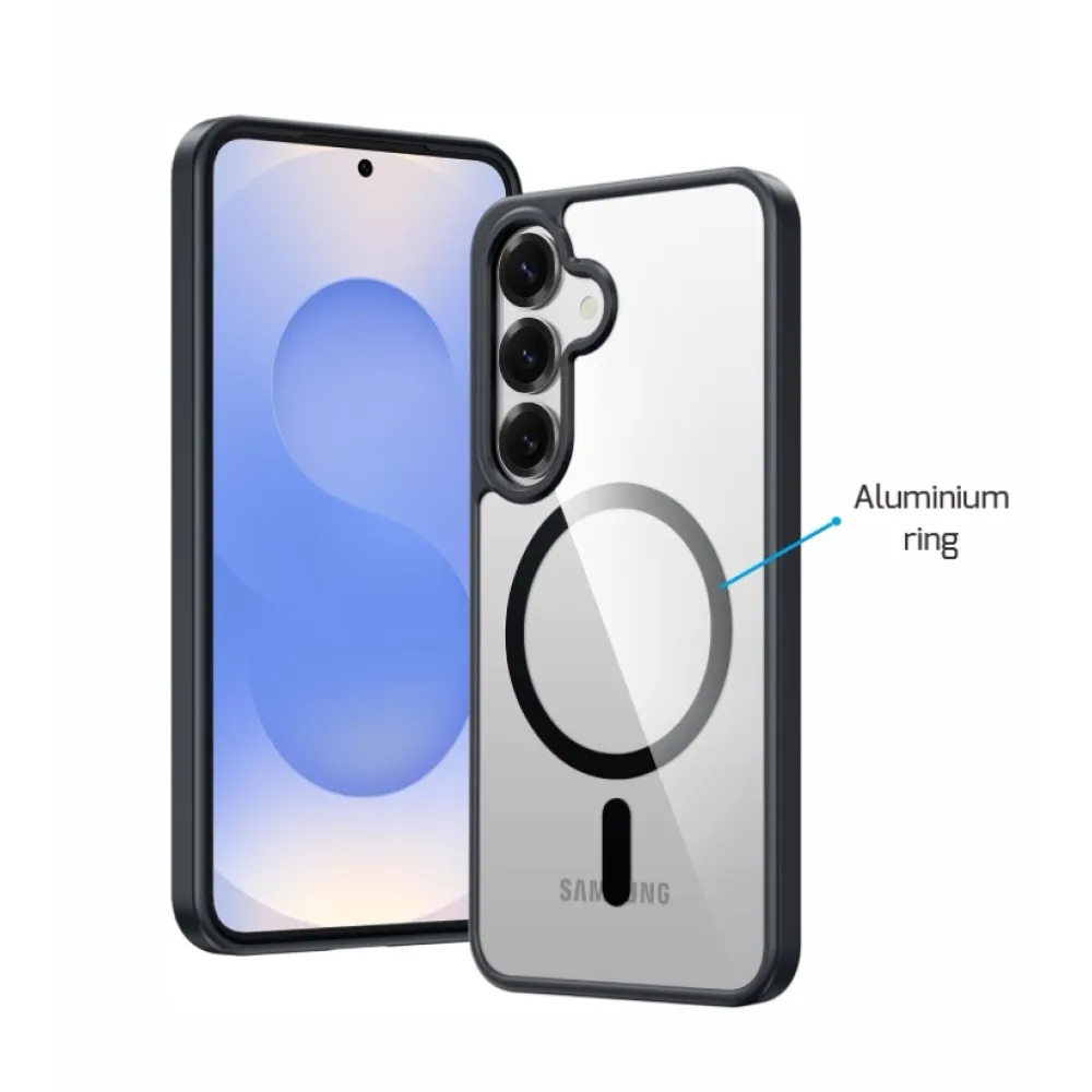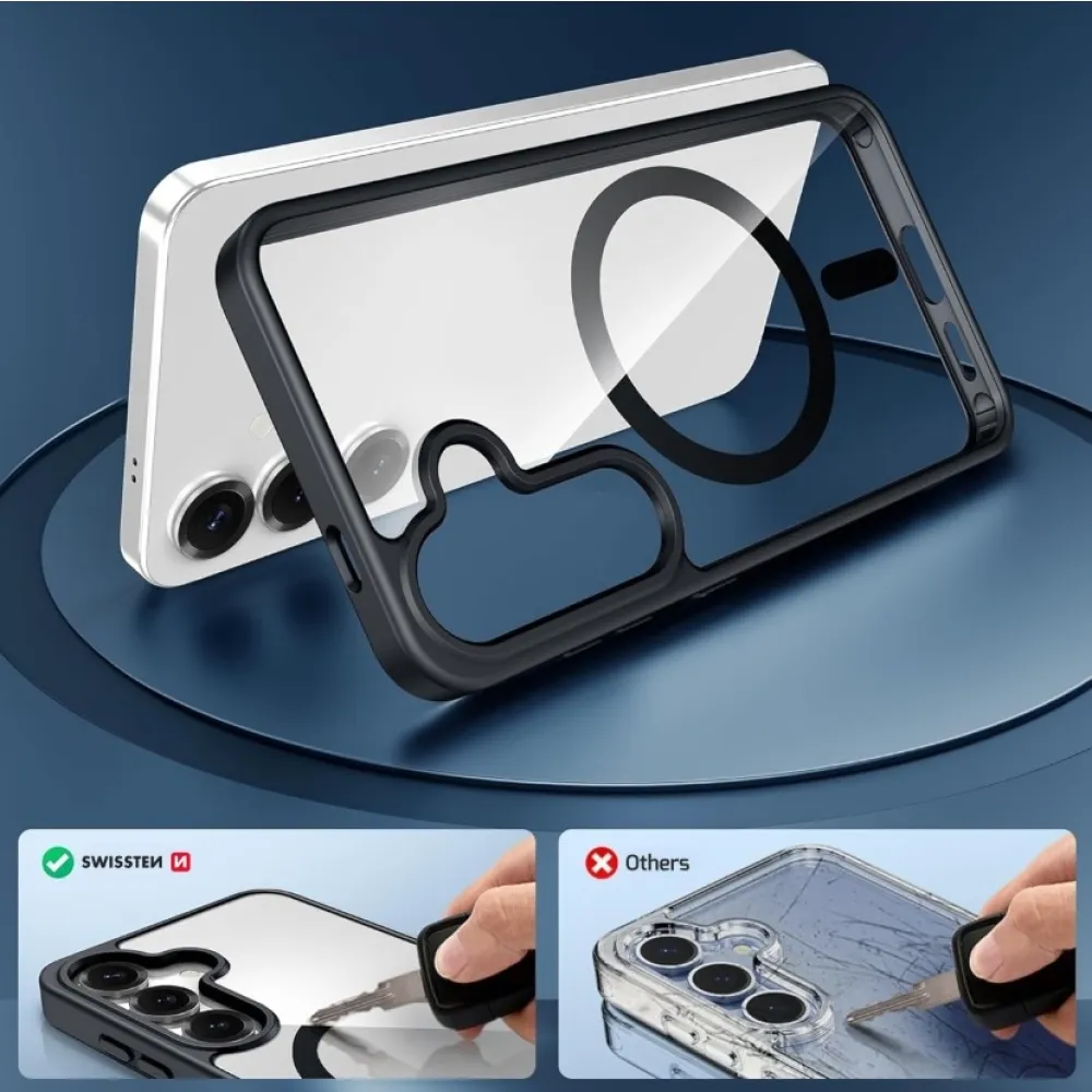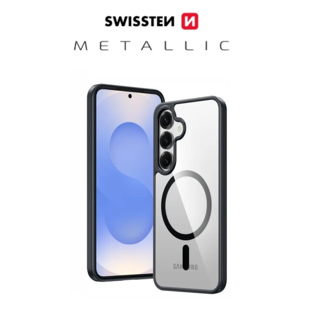 Luxusné číre puzdro SWISSTEN MagStick Metallic na mobil Samsung Galaxy S26 v čiernej farbe s elegantným čiernym rámčekom a metalickými doplnkami. Vhodné na dobíjanie MagSafe. Balené v blistri SWISSTEN
