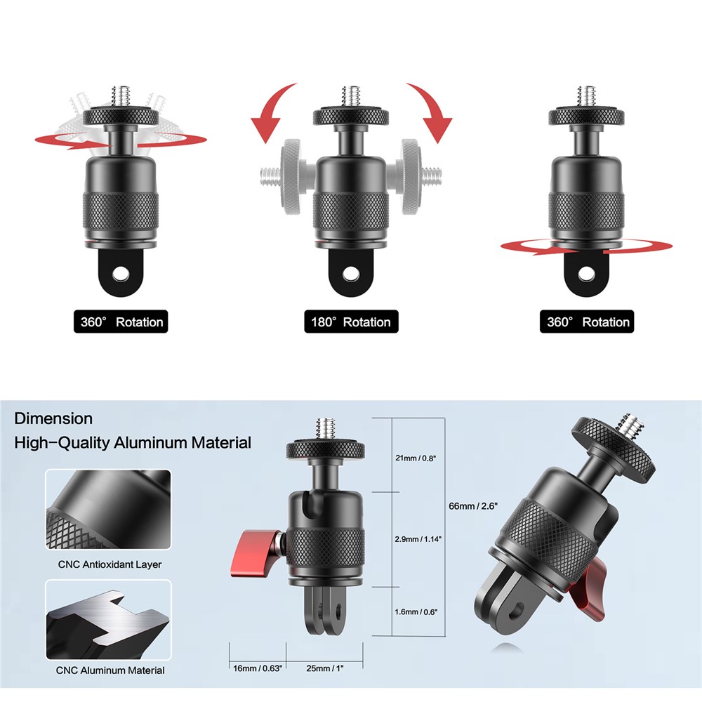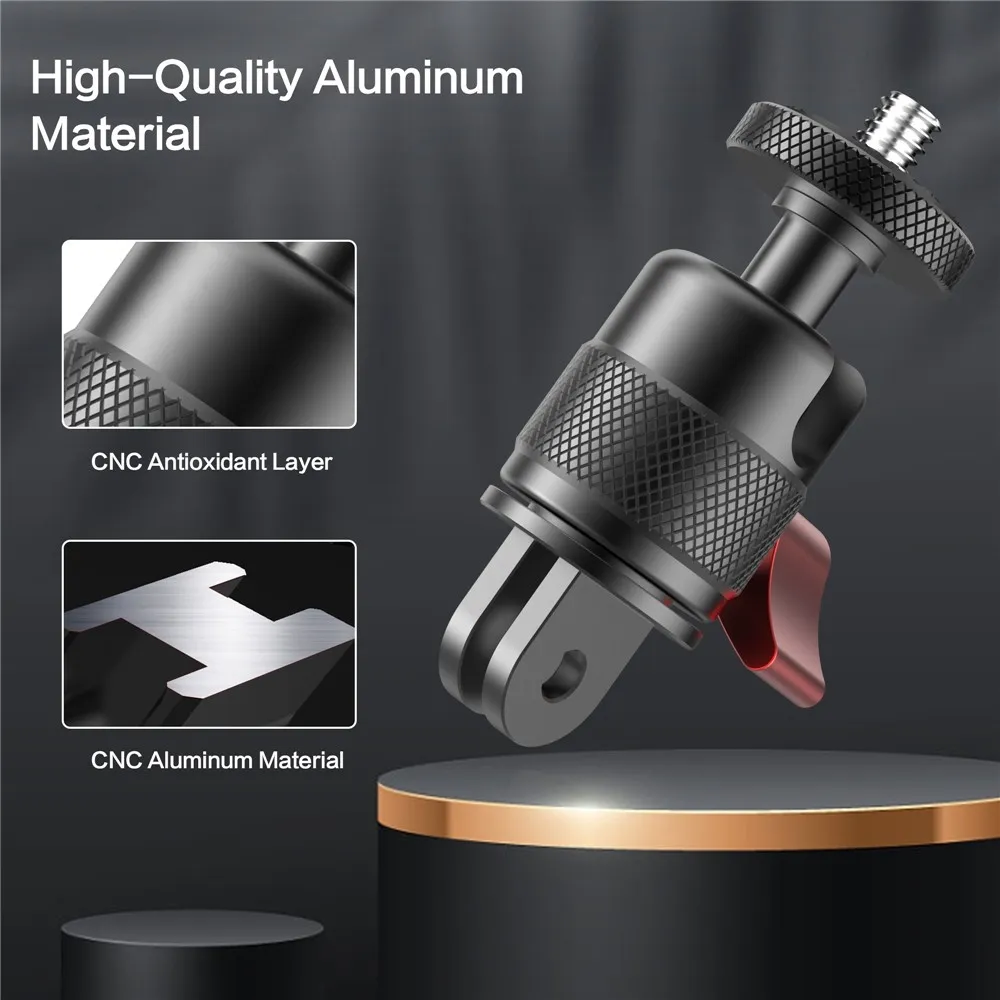 Adaptér je vyrobený z odolnej hliníkovej zliatiny, ktorá zabezpečuje pevnosť, stabilitu a dlhú životnosť aj pri častom používaní v teréne. Otočný mechanizmus umožňuje rýchlu zmenu orientácie kamery bez nutnosti jej demontáže, čo je praktické pri akčnom natáčaní, cestovaní aj tvorbe obsahu.