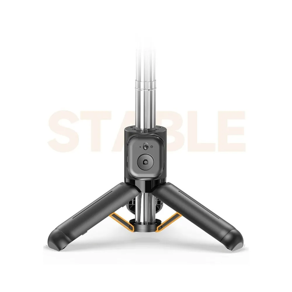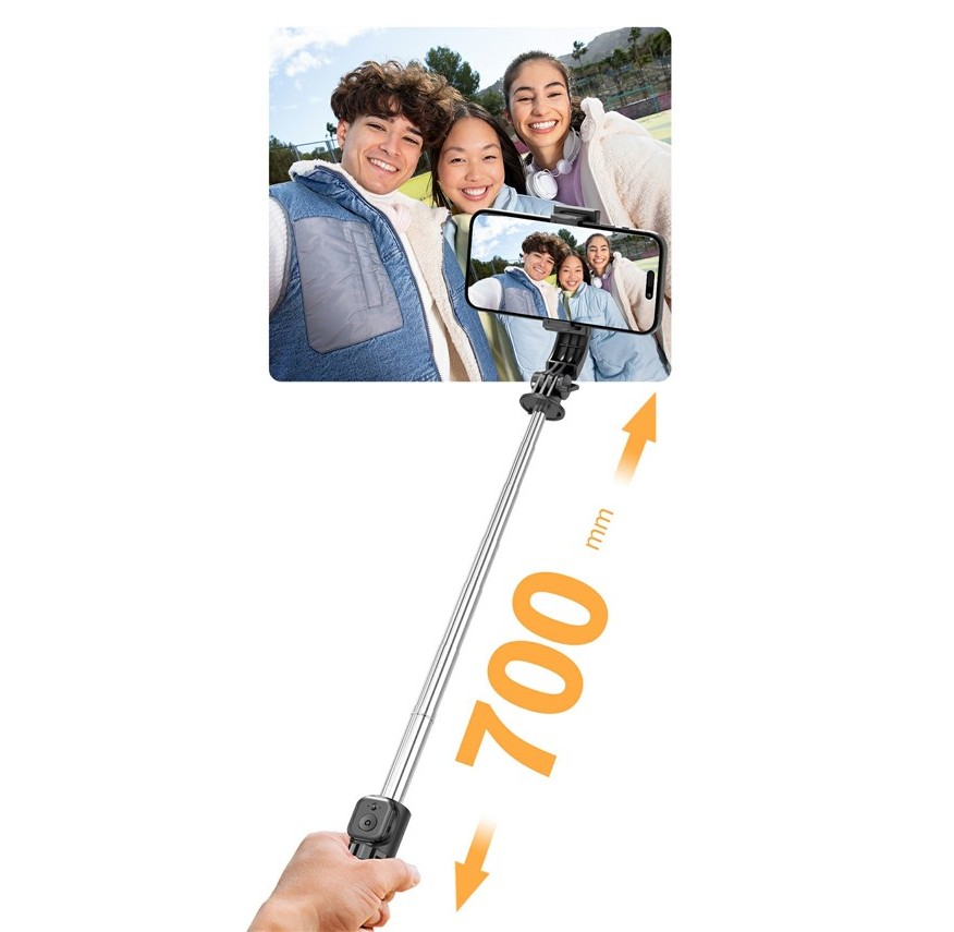 Teleskopická tyč umožňuje roztiahnutie až do výšky 700 mm, čo poskytuje dostatok priestoru na skupinové fotografie aj širšie zábery. Stabilná trojnožka zaisťuje pevné postavenie na stole alebo inej rovnej ploche. Súčasťou je aj odnímateľný Bluetooth ovládač, ktorý umožňuje pohodlné ovládanie fotoaparátu na diaľku až do vzdialenosti 10 metrov.