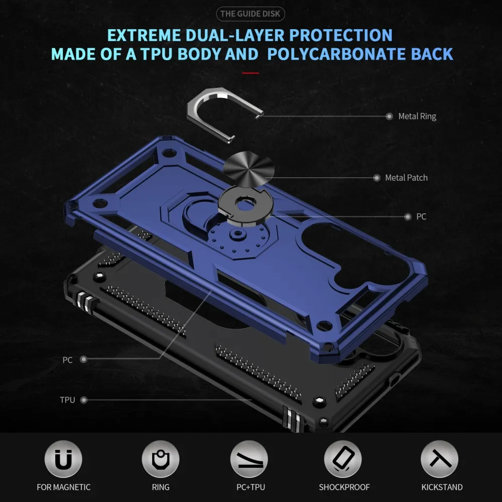 Ring odolný hybridný kryt prináša bezpečie vášmu telefónu po celom obvode a zozadu, pohyblivý kryt šošovky a mierne zvýšené okraje zaisťujú dokonalú ochranu citlivých častí. Kovová časť umožňuje použitie magnetických držiakov do auta.