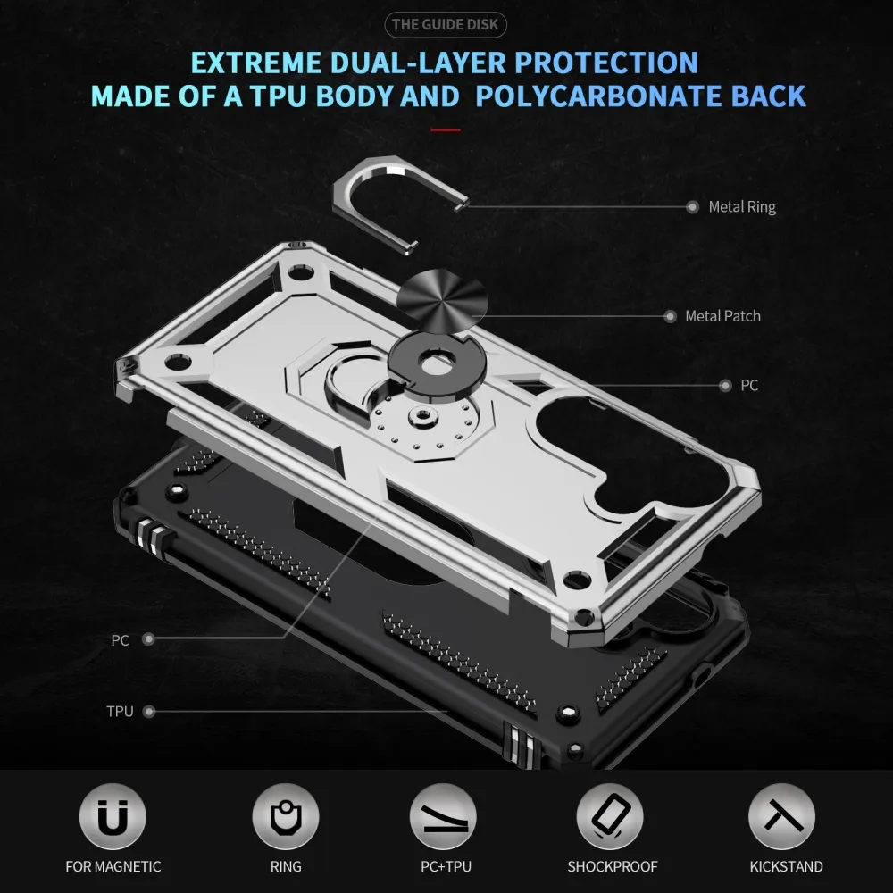 Ring odolný hybridný kryt prináša bezpečie vášmu telefónu po celom obvode a zozadu, pohyblivý kryt šošovky a mierne zvýšené okraje zaisťujú dokonalú ochranu citlivých častí. Kovová časť umožňuje použitie magnetických držiakov do auta.