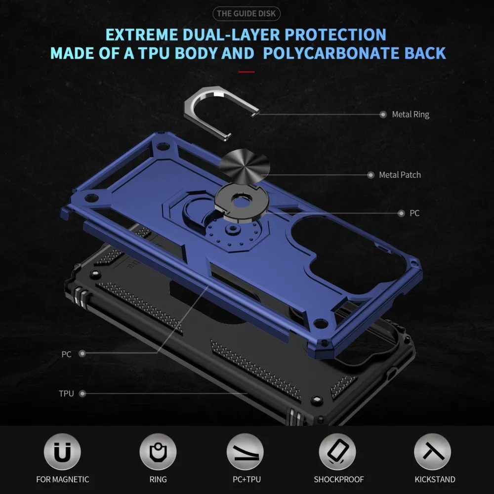 Ring odolný hybridný kryt prináša bezpečie vášmu telefónu po celom obvode a zozadu, pohyblivý kryt šošovky a mierne zvýšené okraje zaisťujú dokonalú ochranu citlivých častí. Kovová časť umožňuje použitie magnetických držiakov do auta.