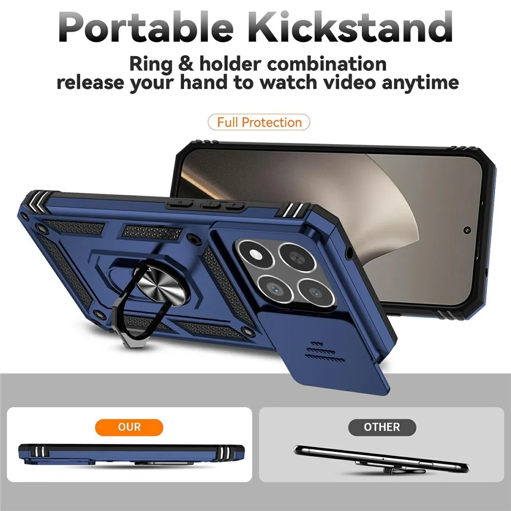 Ring odolný hybridný kryt prináša bezpečie vášmu telefónu po celom obvode a zozadu, pohyblivý kryt šošovky a mierne zvýšené okraje zaisťujú dokonalú ochranu citlivých častí. Kovová časť umožňuje použitie magnetických držiakov do auta.