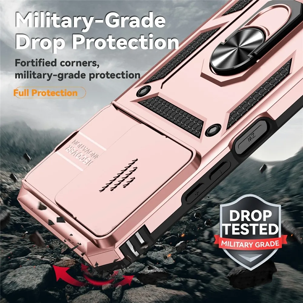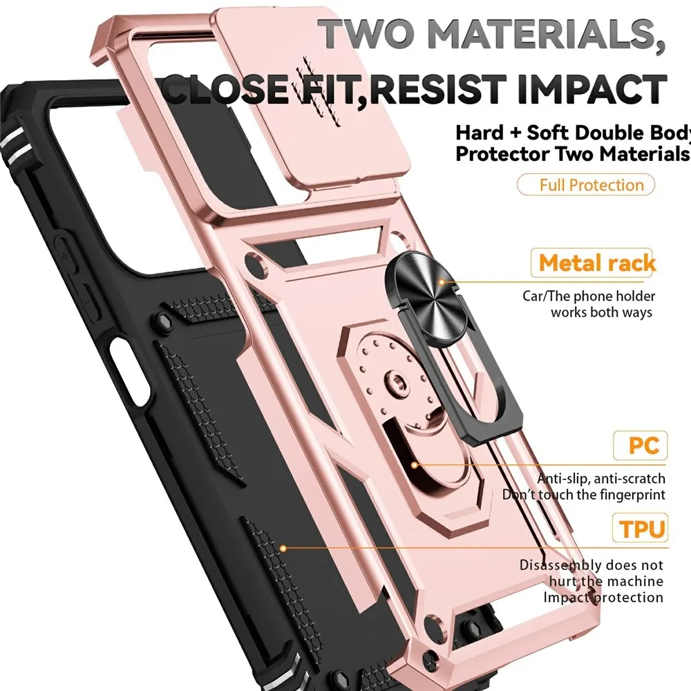 Ring odolný hybridný kryt prináša bezpečie vášmu telefónu po celom obvode a zozadu, pohyblivý kryt šošovky a mierne zvýšené okraje zaisťujú dokonalú ochranu citlivých častí. Kovová časť umožňuje použitie magnetických držiakov do auta.