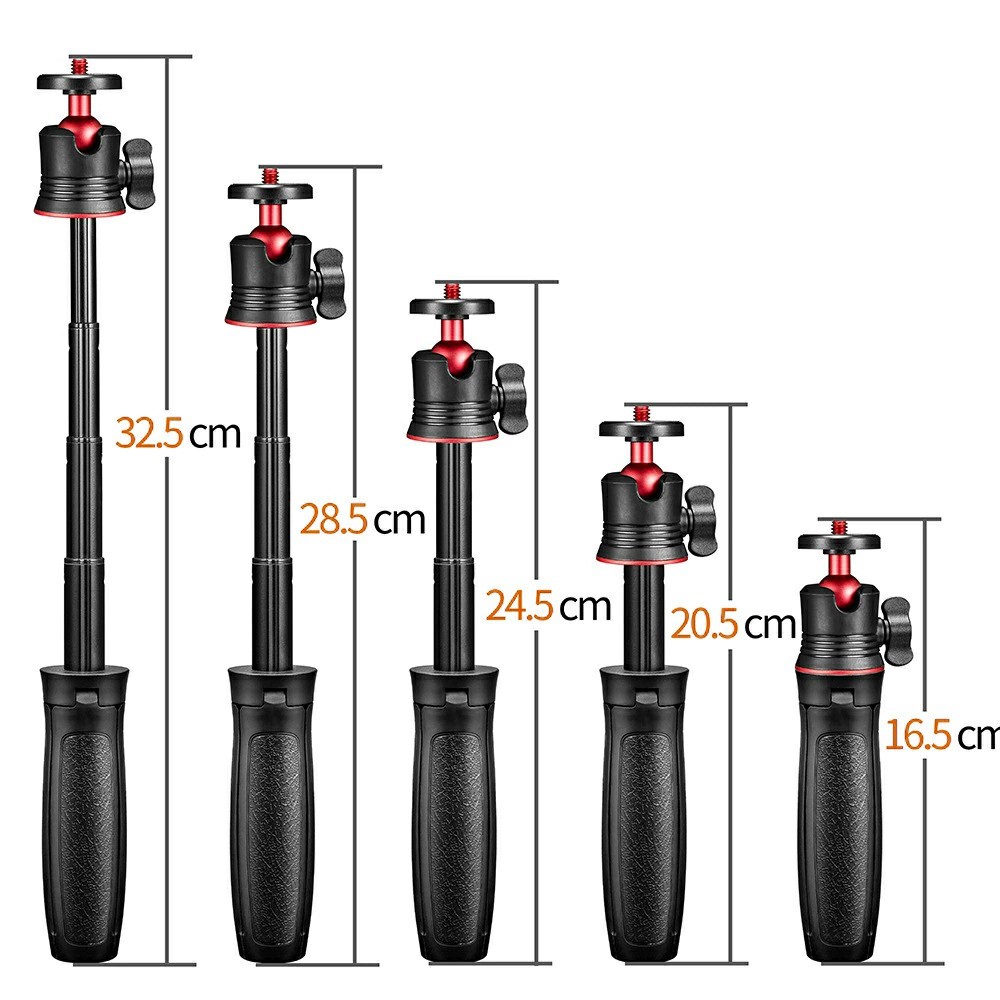 Integrovaný závit 1/4" umožňuje pripojenie väčšiny akčných kamier, držiakov na telefón alebo selfie tyčí. Statív disponuje výsuvnou konštrukciou s nastaviteľnou dĺžkou 16,5 až 32,5 cm.