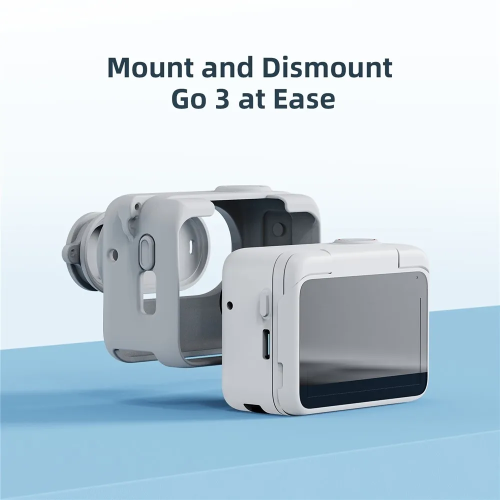 Je vyrobený z pružného silikónu, ktorý tlmí drobné nárazy a zlepšuje úchop pri držaní kamery. Ľahká konštrukcia výrazne nezvyšuje hmotnosť zariadenia a zachováva jeho kompaktné rozmery. Súčasťou je aj poistná šnúrka proti strate a praktická šnúrka na krk.