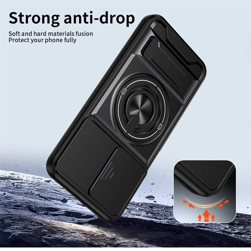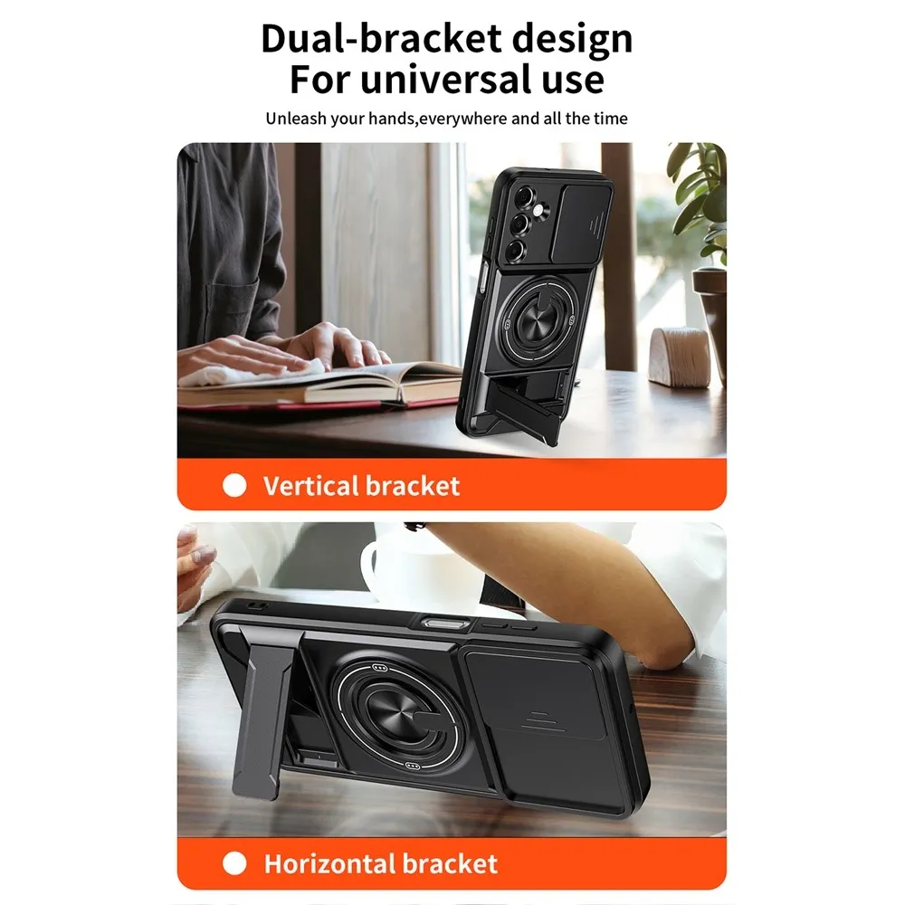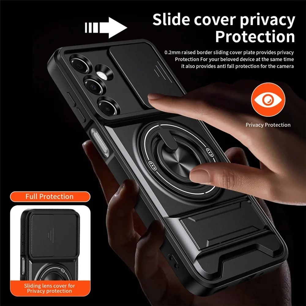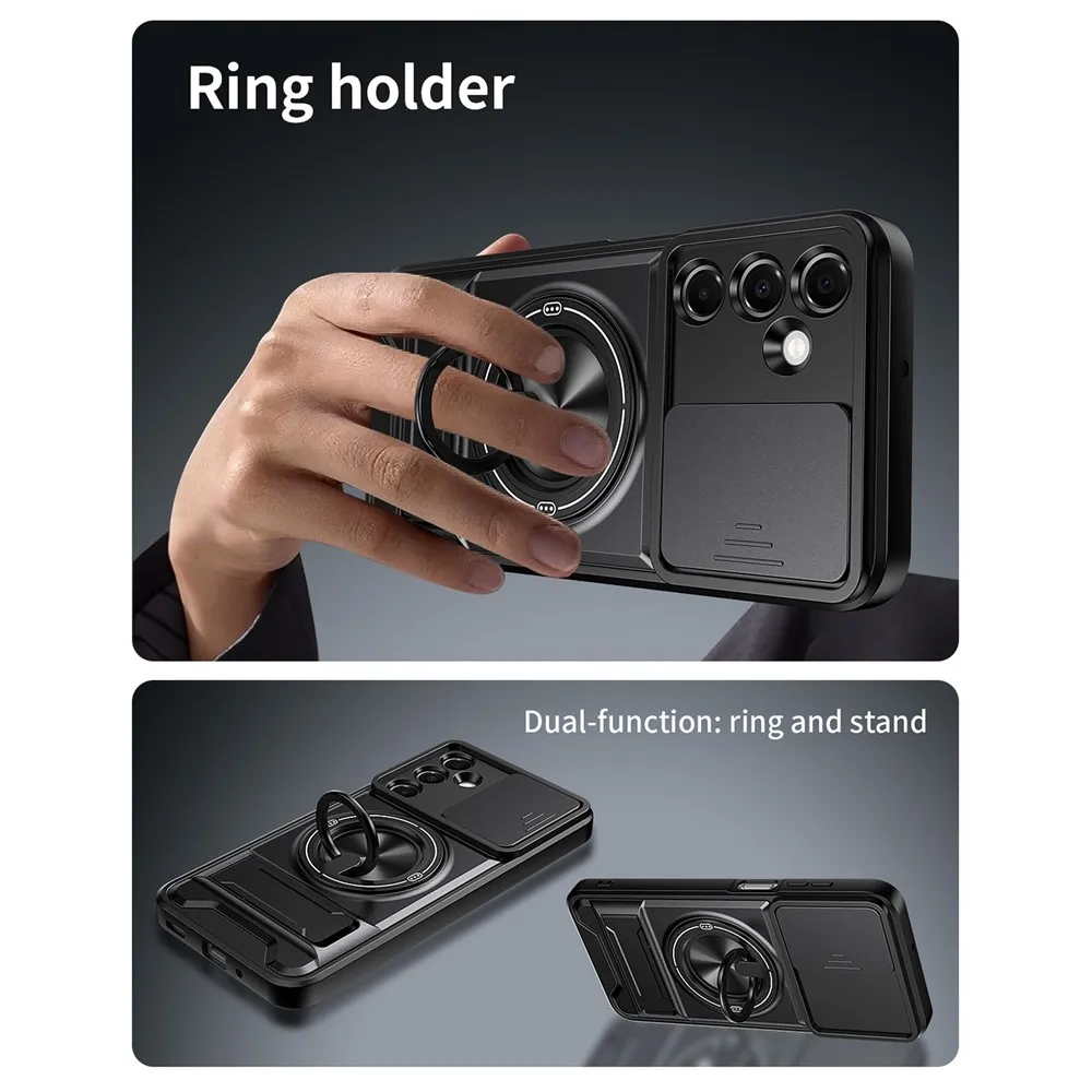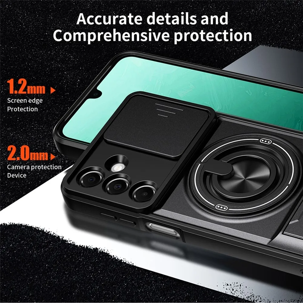 Robustná konštrukcia s výraznými líniami dodáva tomuto púzdru technický a odolný vzhľad, ktorý presne sedí na tvar telefónu Samsung Galaxy A37 5G. Zadná časť v čiernej farbe je doplnená integrovaným otočným krúžkom a výklopným stojanom pre pohodlné držanie aj sledovanie obsahu. Pevný obal chráni chrbát, hrany aj modul fotoaparátu pri každodennom používaní aj náročnejších situáciách. Tento kryt patrí medzi púzdra, ktoré spájajú vysokú ochranu, funkčnosť a výrazný dizajn vytvorený priamo pre konkrétny model telefónu. ✅【Dvojvrstvová ochrana】Kombinuje mäkké materiály TPU a tvrdé PC pre zvýšenú odolnosť, odolnosť proti poškriabaniu, pádu a odtlačkom prstov. ✅【Magnetická kompatibilita】Vstavaný silný magnetický krúžok kompatibilný s magnetickými držiakmi do auta a ďalším magnetickým príslušenstvom pre pohodlné uchytenie. ✅【Držiak na krúžok a skladací stojanček】Vybavené integrovaným 360° otočným držiakom na krúžok pre jednoduché ovládanie jednou rukou. Vstavaný skladací stojan umožňuje jednoduché prepínanie medzi horizontálnym a vertikálnym režimom, ideálny pre použitie bez použitia rúk. ✅【Presné výrezy a zvýšená ochrana】Presné výrezy umožňujú ľahký prístup ku všetkým funkciám, portom a tlačidlám. Zvýšený okraj obrazovky a fotoaparátu lepšie chráni váš telefón pred náhodným poškodením. ✅【Posuvný kryt objektívu】Navržený s posuvným krytom objektívu, ktorý poskytuje zvýšenú ochranu objektívov fotoaparátu a zabraňuje poškriabaniu a poškodeniu.