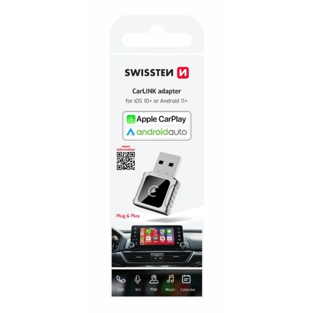 SWISSTEN CarLINK adaptér umožní bezdrôtové prepojenie vášho smartfónu s vozidlom cez Apple CarPlay alebo Android Auto. Už žiadne káble – navigáciu, hovory, hudbu aj správy si vychutnáte pohodlne a bezpečne počas jazdy. Vďaka kompaktným rozmerom a prémiovému spracovaniu z kovovej zliatiny a tvrdeného skla sa adaptér stane nenápadným, ale spoľahlivým pomocníkom na každú cestu.