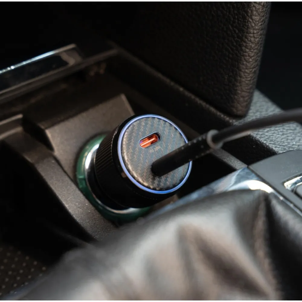 Výkonná autonabíjačka s dvojicou USB-C portov a podporou PD 3.0, dodávaná s prémiovým USB-C/USB-C káblom (1 m, 60W, 3A, soft silicone). Celkový výkon až 50W. Modrý LED krúžok pre jednoduché použitie aj za tmy.