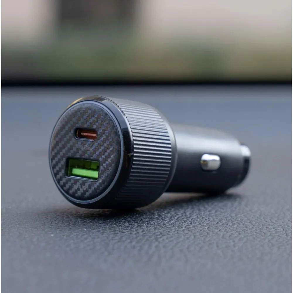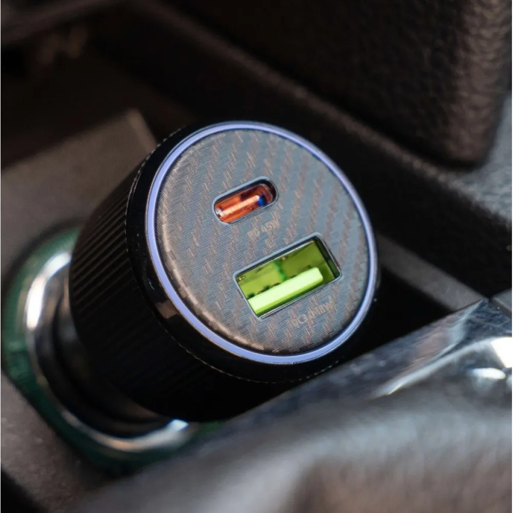 Výkonná autonabíjačka s podporou PD 3.0 a QC 3.0, ideálna pre nabíjanie notebookov, tabletov aj smartfónov. Súčasťou balenia je USB-C/USB-C kábel (1 m, 60 W, 3A, soft silicone). Modrý LED prstenec uľahčí pripojenie kábla aj pri jazde v noci.