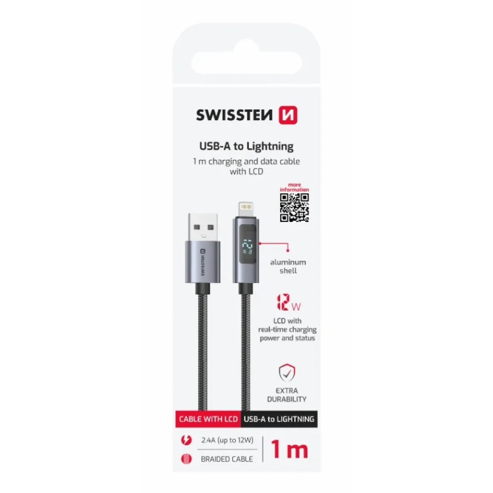 SWISSTEN LCD kábel USB-A/Lightning 1 m prináša revolučný spôsob, ako mať neustály prehľad o priebehu nabíjania vášho zariadenia. Vďaka integrovanému LCD displeju okamžite vidíte aktuálny výkon vo wattoch a indikáciu technológie Power Delivery, čo vám umožní efektívne kontrolovať rýchlosť nabíjania.