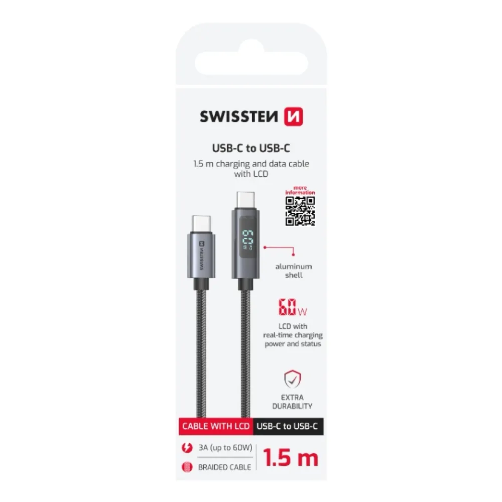 SWISSTEN LCD kábel USB-C/USB-C 1,5 m prináša revolučný spôsob, ako mať neustály prehľad o priebehu nabíjania vášho zariadenia. Vďaka integrovanému LCD displeju okamžite vidíte aktuálny výkon vo wattoch a indikáciu technológie Power Delivery, čo vám umožní efektívne kontrolovať rýchlosť nabíjania.