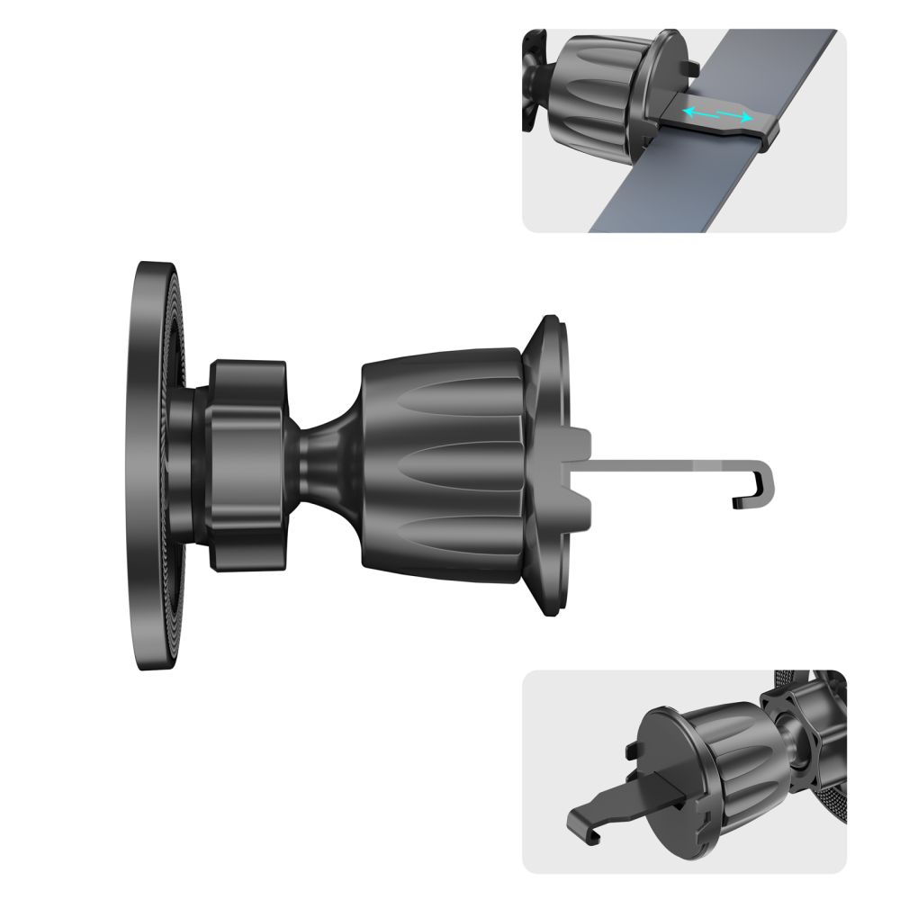 Vďaka 360° otočnej hlavici si jednoducho nastavíte ideálny uhol pre navigáciu, hovory aj sledovanie notifikácií. Držiak ponúka maximálnu flexibilitu použitia, pretože ho možno upevniť na palubnú dosku, čelné sklo alebo ventilačnú mriežku. Stabilitu na hladkých plochách zabezpečuje silná prísavka s aretačným mechanizmom, zatiaľ čo háčikový adaptér pevne drží vo ventilácii.