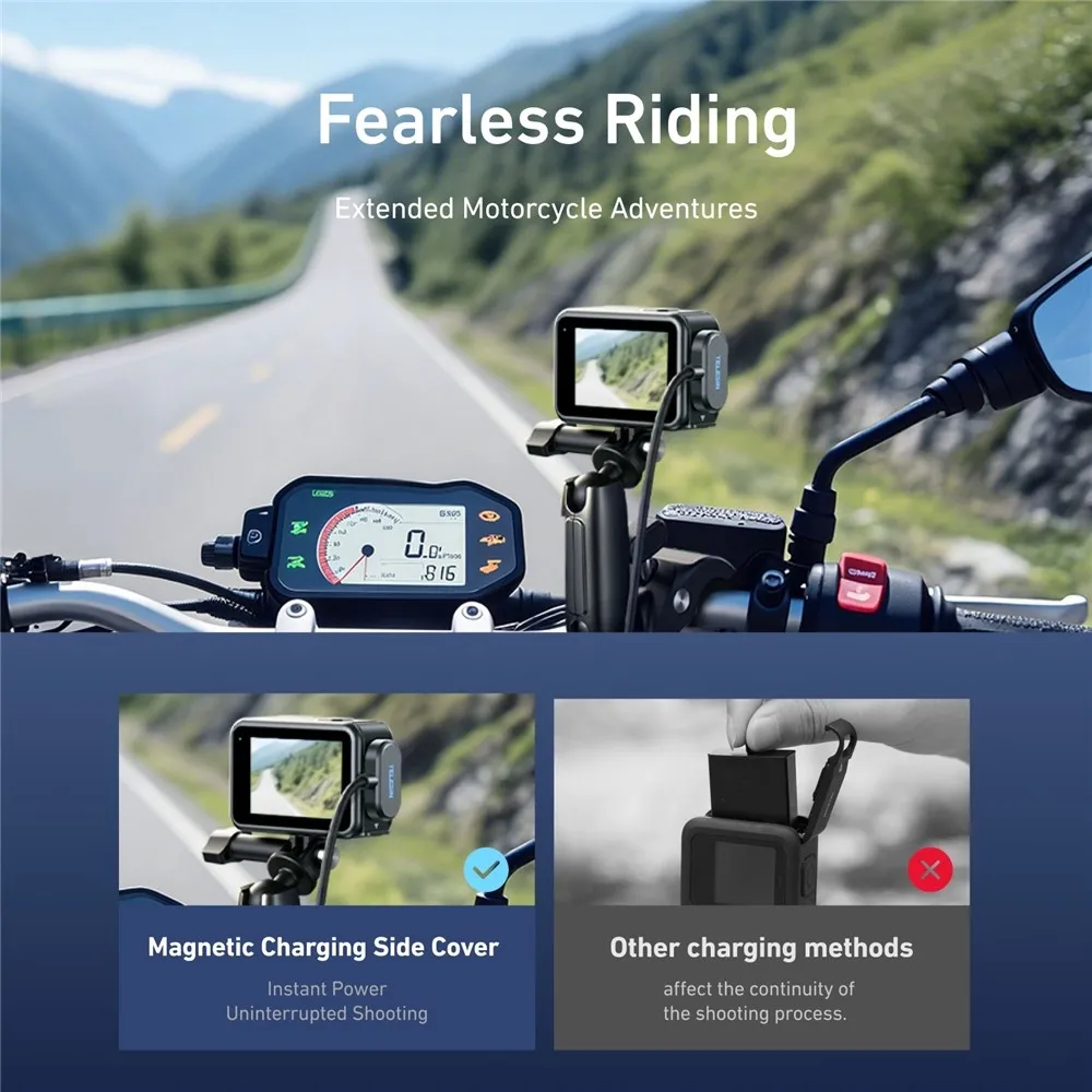 TELESIN S6-CLC-01-TGP magnetický nabíjací kábel pre GoPro predstavuje praktické riešenie pre pohodlné napájanie kamery bez nutnosti otvárať originálny kryt batérie. Integrovaná bočná krytka s magnetickým konektorom umožňuje rýchle pripojenie kábla a zároveň chráni napájací port pred prachom a striekajúcou vodou. Vďaka tomu je kábel ideálny na natáčanie v teréne, pri športe aj počas premenlivého počasia.
