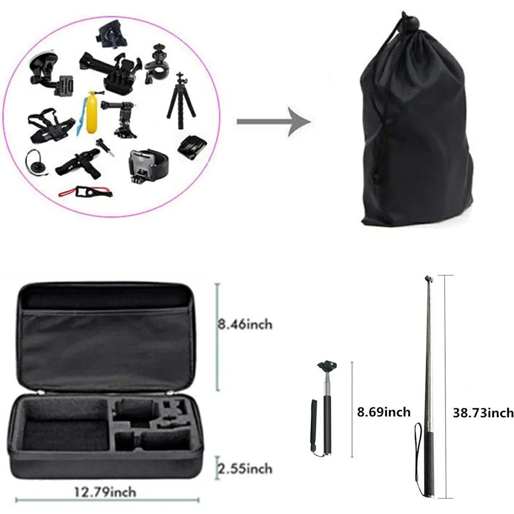 Sada ponúka hrudný popruh a hlavový popruh na natáčanie z pohľadu prvej osoby, ideálne pri cyklistike, lyžovaní, behu alebo turistike. Predlžovacie ramená a nastaviteľné otočné adaptéry umožňujú presné nastavenie uhla záberu. Držiak na riadidlá bicykla zabezpečí stabilný záznam počas jazdy a prísavný držiak na sklo umožňuje upevnenie kamery na čelné sklo automobilu alebo iné hladké povrchy. Súčasťou je aj teleskopická tyč na natáčanie a tripod statív, ktoré poskytujú stabilný základ pre vlogovanie aj skupinové fotografie.