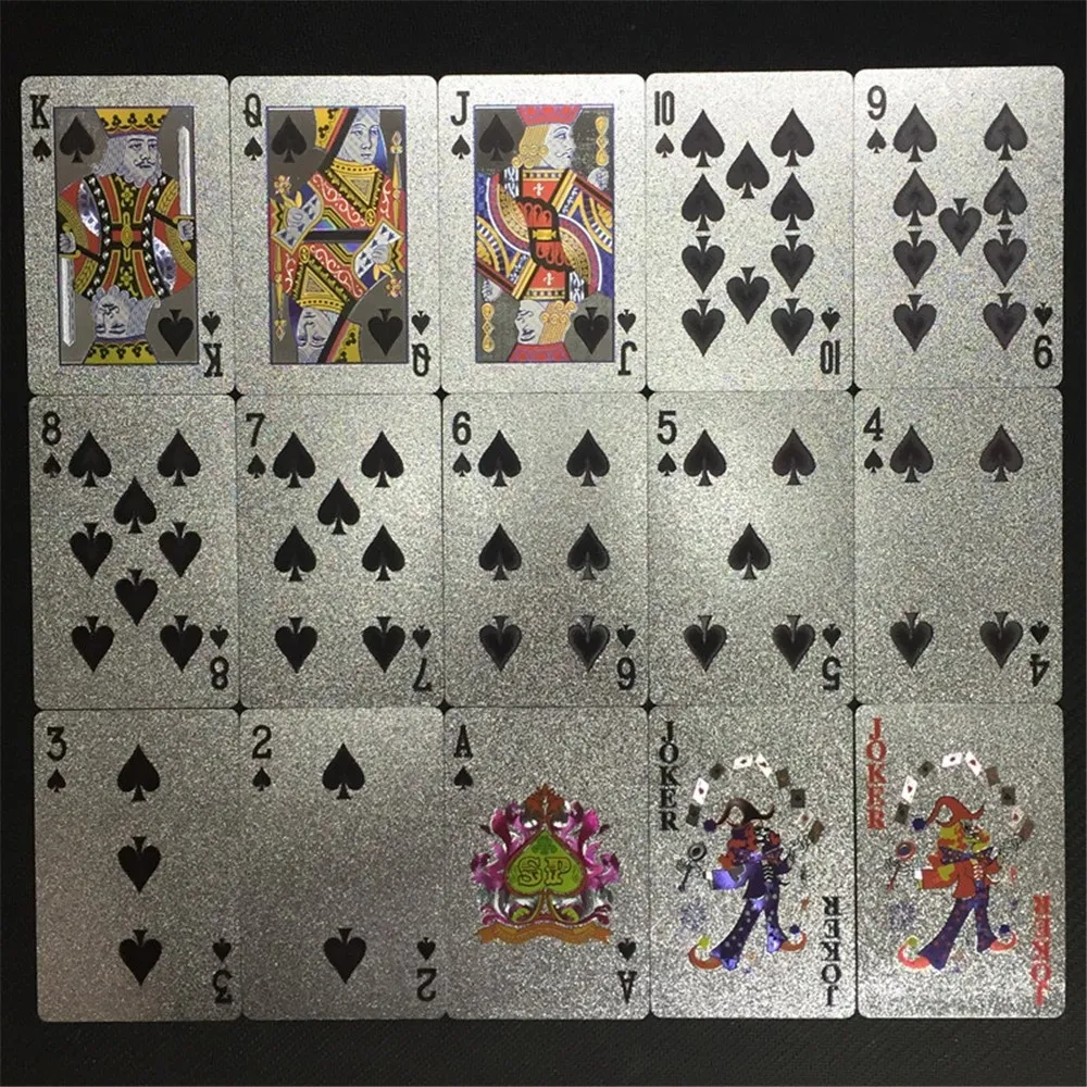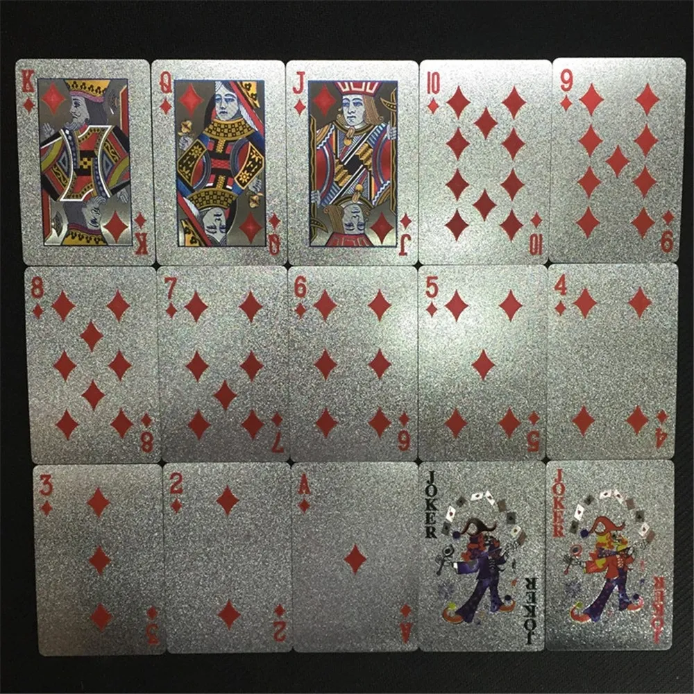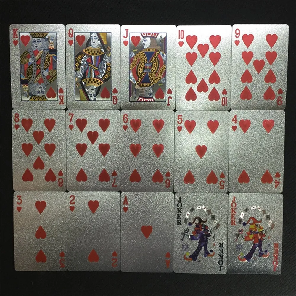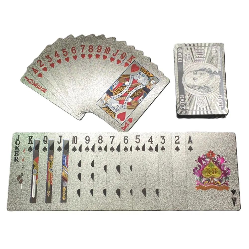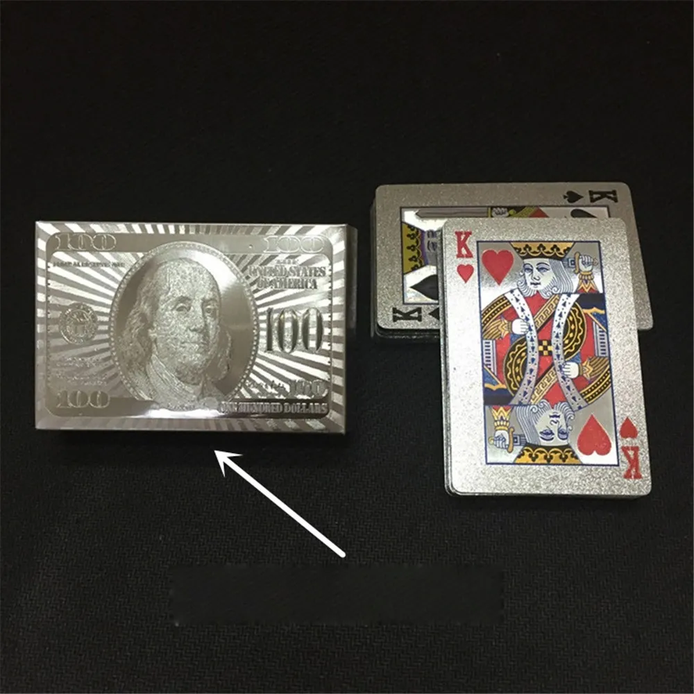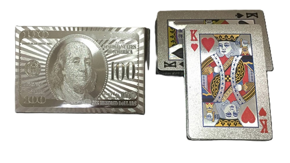 Počet kariet: 54 ks Materiál: plast Prevedenie: strieborný motív 100 dolárov Vlastnosti: vodoodolné, umývateľné