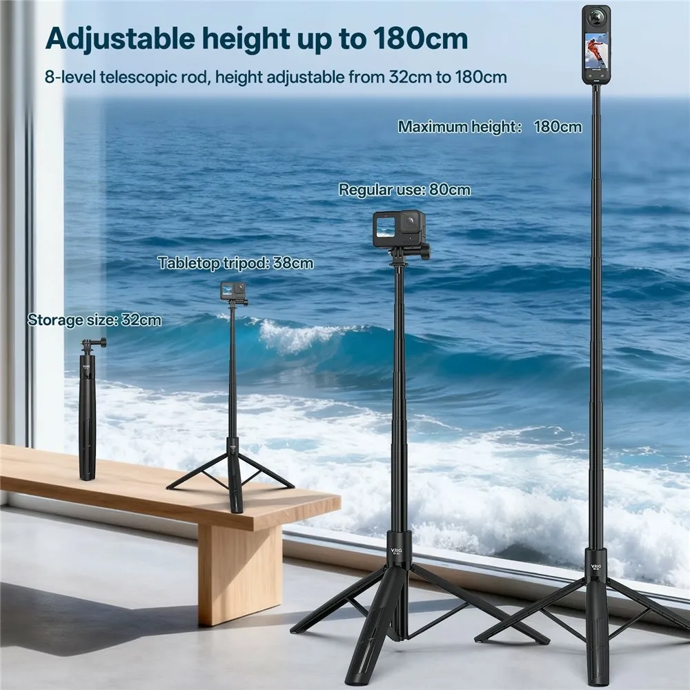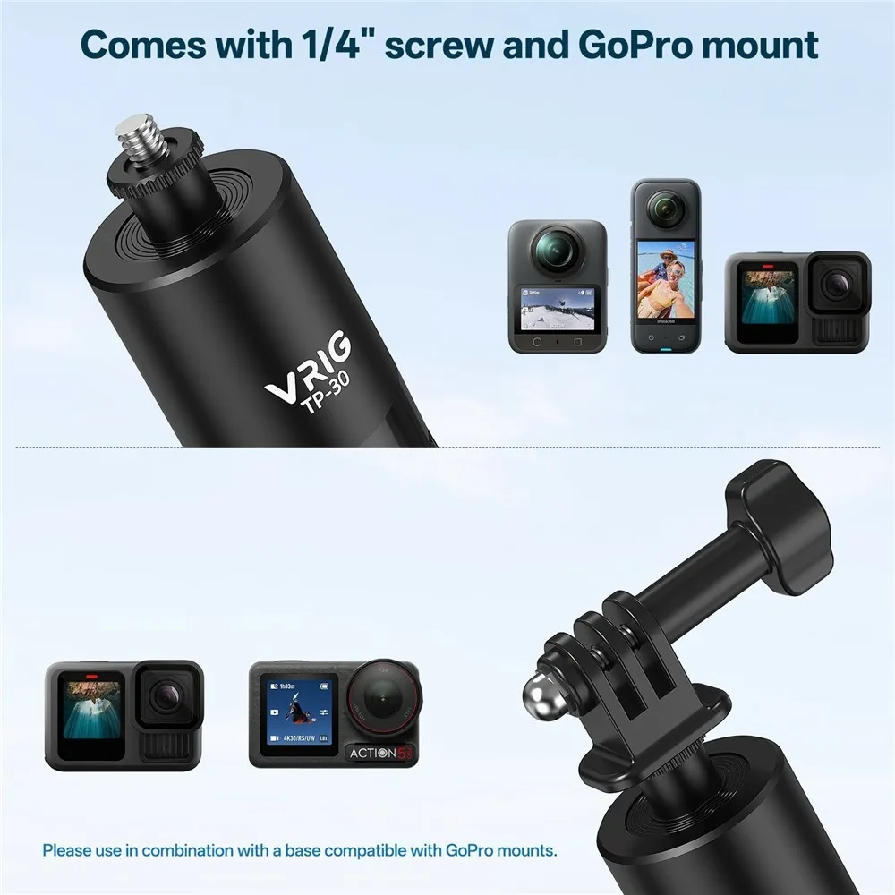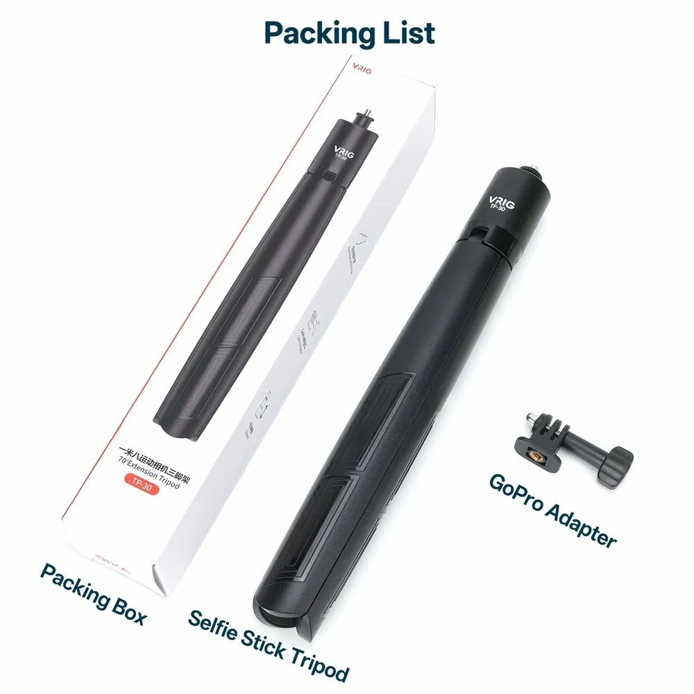 Teleskopický statív VRIG TP-30 je navrhnutý pre akčné kamery aj mobilné telefóny a umožňuje stabilné natáčanie v exteriéri aj interiéri. Vďaka výškovo nastaviteľnej konštrukcii až do 180 cm je vhodný na vlogovanie, panoramatické zábery aj skupinové fotografie. Kombinácia selfie tyče a statívu v jednom zariadení zabezpečuje flexibilné použitie bez potreby ďalšieho príslušenstva.