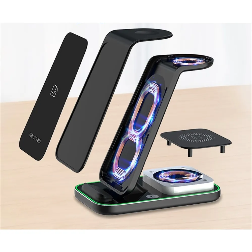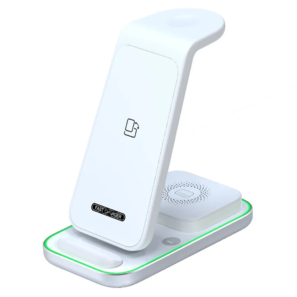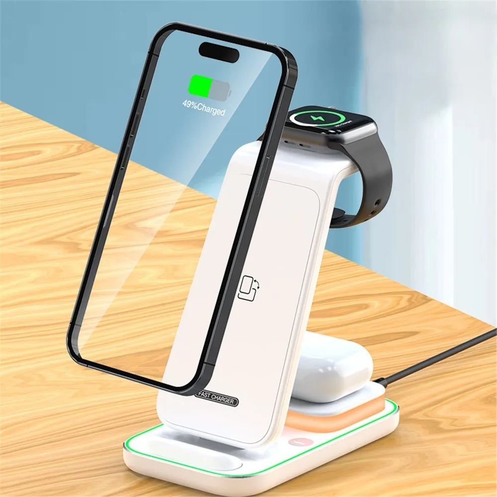 YF-A6 bezdrôtová nabíjacia stanica 3v1 s nočným svetlom a duálnou cievkou je praktické riešenie na súčasné nabíjanie viacerých zariadení. Umožňuje pohodlné nabíjanie mobilného telefónu, bezdrôtových slúchadiel a Apple Watch na jednom mieste bez zbytočných káblov.