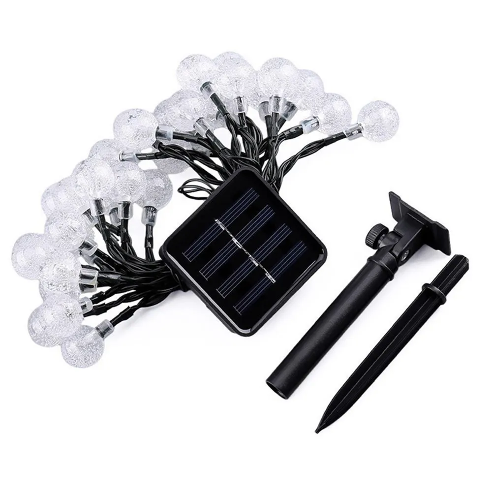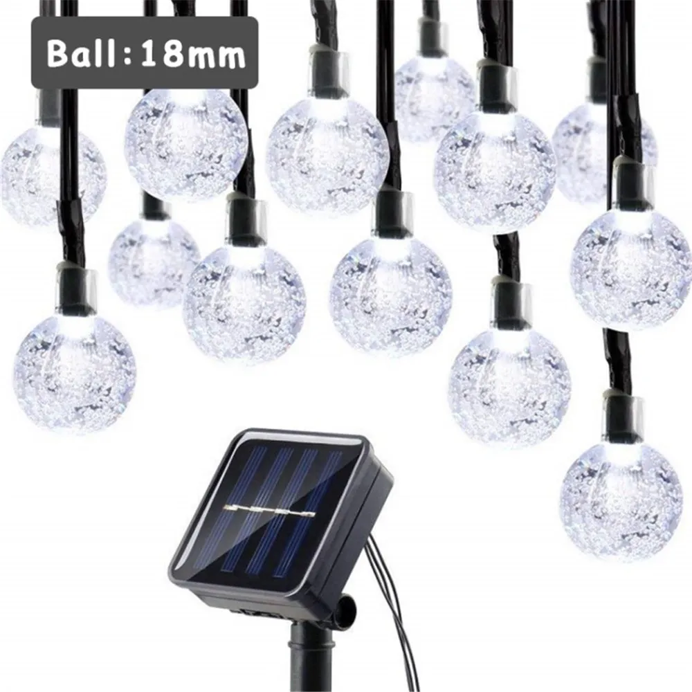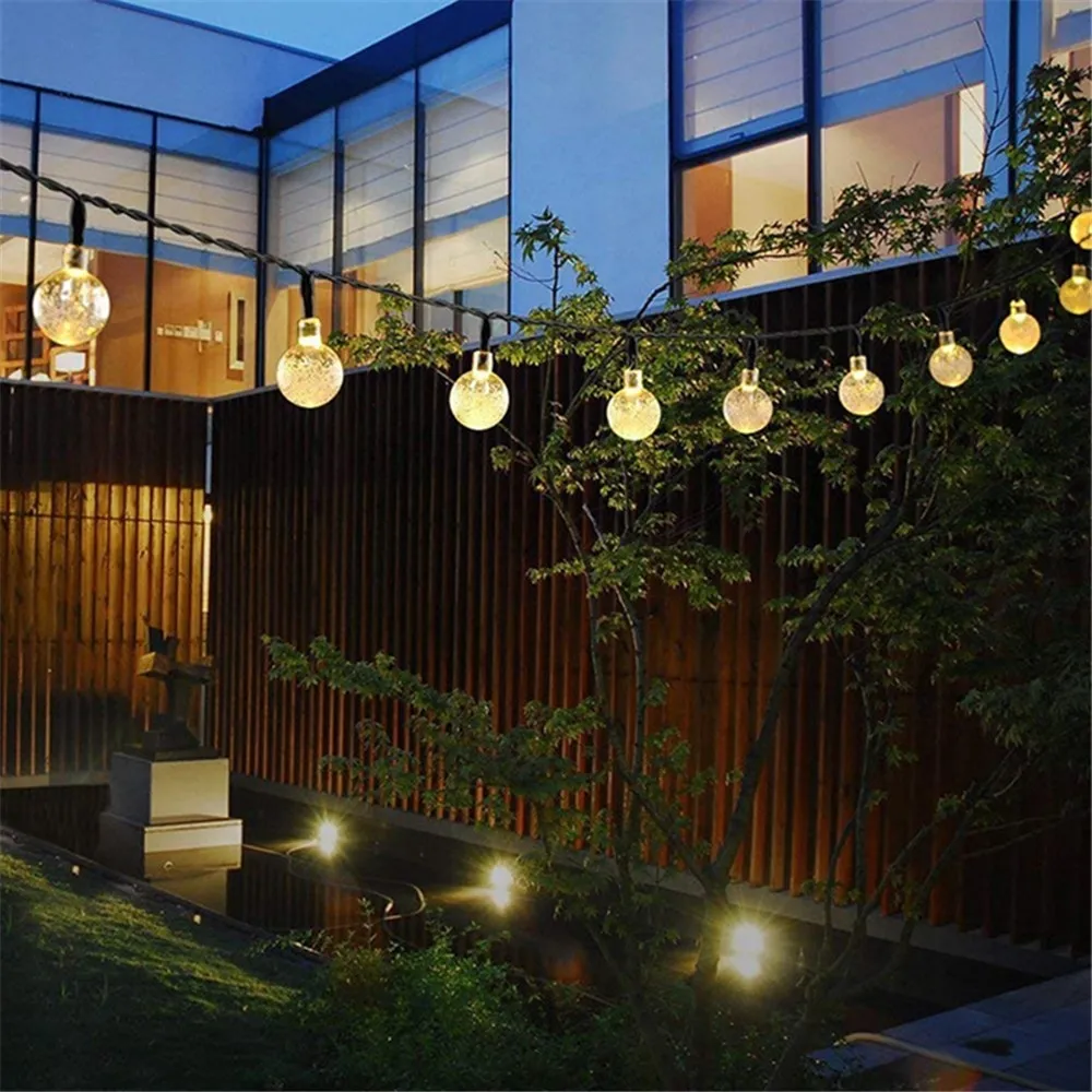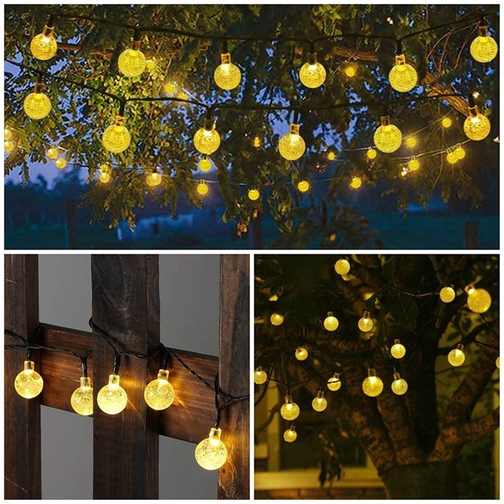 Krištáľové gule pôsobia elegantne a rozptyľujú svetlo do príjemného efektu. Vonkajší LED reťaz na solárny pohon je vhodný na dekoráciu pergol, plotov, stromov aj altánkov a dodá priestoru štýlový a slávnostný vzhľad.